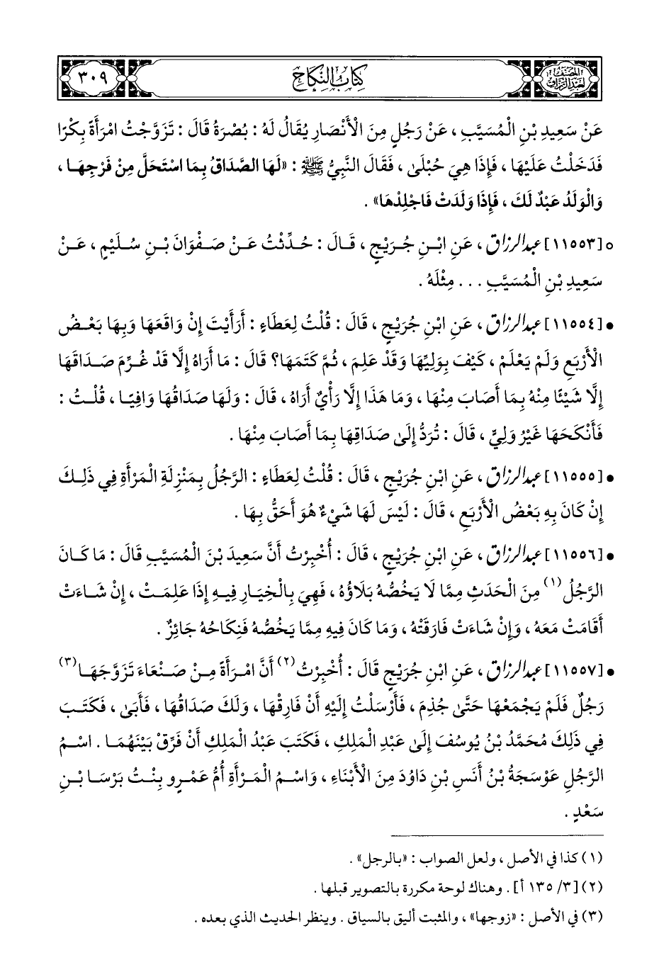 • [١١٥٥٧] عبد الرزاق، عَنِ ابْنِ جُرَيْجٍ قَالَ: أُخْبِرْتُ (¬٢) أَنَّ امْرَأَةَ مِنْ صَنْعَاءَ تَزَوَّجَهَا (¬٣) رَجُلٌ فَلَمْ يَجْمَعْهَا حَتَّى جُذِمَ، فَأَرْسَلْتُ إِلَيْهِ أَنْ فَارِقْهَا، وَلَكَ صدَاقُهَا، فَأَبَى، فَكَتَبَ فِي ذَلِكَ مُحَمَّدُ بْنُ يُوسُفَ إِلَى عَبْدِ الْمَلِكِ، فَكَتَبَ عَبْدُ الْمَلِكِ أَنْ فَرِّقْ بَيْنَهُمَا. اسْمُ الرَّجُلِ عَوْسَجَةُ بْنُ أَنَسِ بْنِ دَاوُدَ مِنَ الْأَبْنَاءِ، وَاسْمُ الْمَرْأَةِ أُمُّ عَمْرٍو بِنْتُ بَرْسَا بْنِ سَعْدٍ.