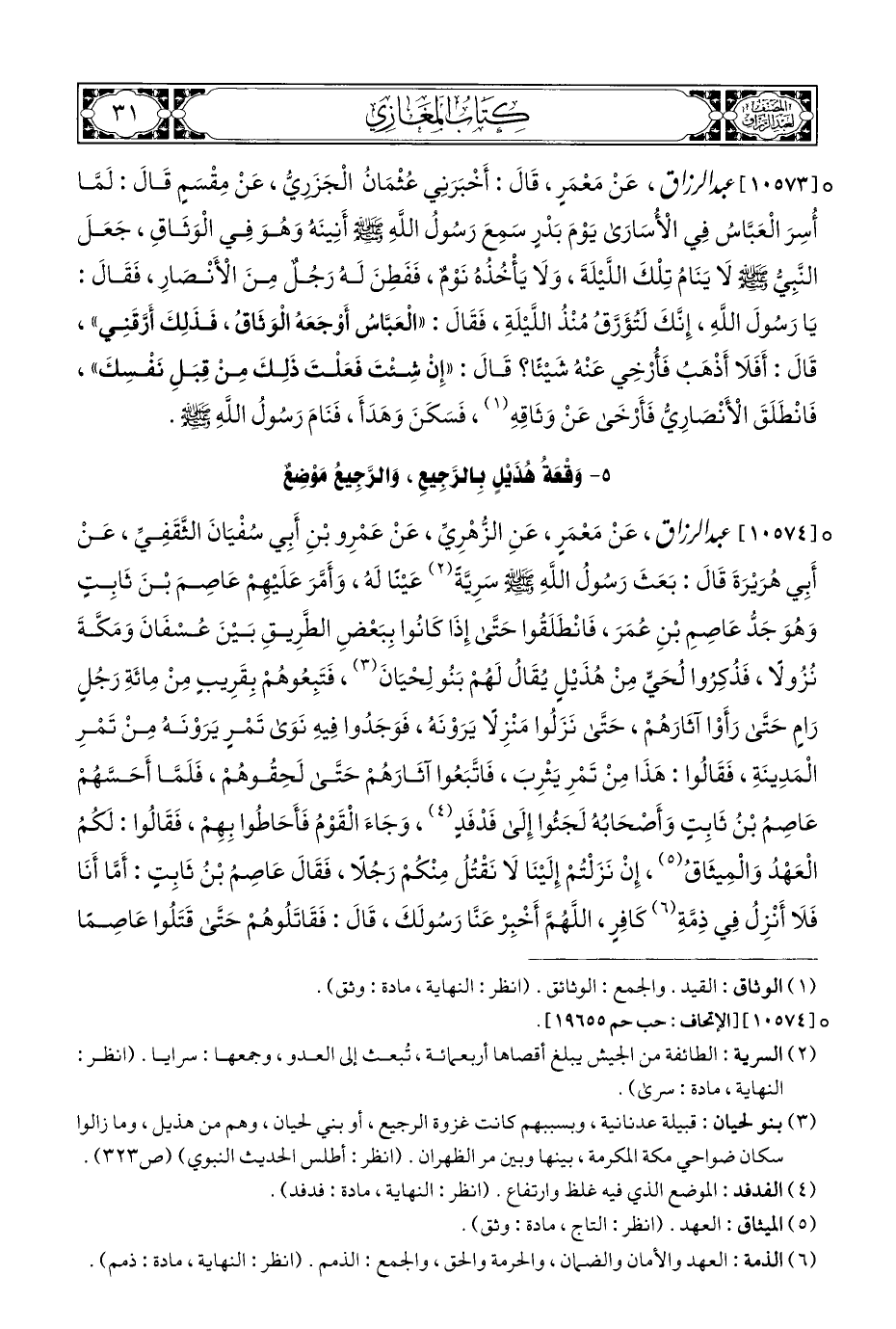 ° [١٠٥٧٤] عبد الرزاق، عَنْ مَعْمَرٍ، عَنِ الزُّهْرِيِّ، عَنْ عَمْرِو بْنِ أَبِي سُفْيَانَ الثَّقَفِيِّ، عَنْ أَبِي هُرَيْرَةَ قَالَ: بَعَثَ رَسُولُ اللهِ - صلى الله عليه وسلم - سَرِيَّةَ (¬٢) عَيْنًا لَهُ، وَأَمَّرَ عَلَيْهِمْ عَاصِمَ بْنَ ثَابِتٍ وَهُوَ جَدُّ عَاصِمِ بْنِ عُمَرَ، فَانْطَلَقُوا حَتَّى إِذَا كَانُوا بِبَعْضِ الطَّرِيقِ بَيْنَ عُسْفَانَ وَمَكَّةَ نُزُولًا، فَذُكِرُوا لُحَيٍّ مِنْ هُذَيْلٍ يُقَالُ لَهُمْ بَنُو لِحْيَانَ (¬٣)، فَتَبِعُوهُمْ بِقَرِيبٍ مِنْ مِائَةِ رَجُلٍ رَامٍ حَتَّى رَأَوْا آثَارَهُمْ، حَتَّى نَزَلُوا مَنْزِلًا يَرَوْنَهُ، فَوَجَدُوا فِيهِ نَوَى تَمْرٍ يَرَوْنَهُ مِنْ تَمْرِ الْمَدِينَةِ، فَقَالُوا: هَذَا مِنْ تَمْرِ يَثْرِبَ، فَاتَّبَعُوا آثَارَهُمْ حَتَّى لَحِقُوهُمْ، فَلَمَّا أَحَسَّهُمْ عَاصِمُ بْنُ ثَابِتٍ وَأَصْحَابُهُ لَجَئُوا إِلَى فَدْفَدٍ (¬٤)، وَجَاءَ الْقَوْمُ فَأَحَاطُوا بِهِمْ، فَقَالُوا: لكُمُ الْعَهْدُ وَالْمِيثَاقُ (¬٥)، إِنْ نَزَلْتُمْ إِلَيْنَا لَا نَقْتُلُ مِنْكُمْ رَجُلًا، فَقَالَ عَاصِمُ بْنُ ثَابِتٍ: أَمَّا أَنَا فَلَا أَنْزِلُ فِي ذِمَّةِ (¬٦) كَافِرٍ، اللَّهُمَّ أَخْبِرْ عَنَّا رَسُولَكَ، قَالَ: فَقَاتَلُوهُمْ حَتَّى قَتَلُوا عَاصِمًا