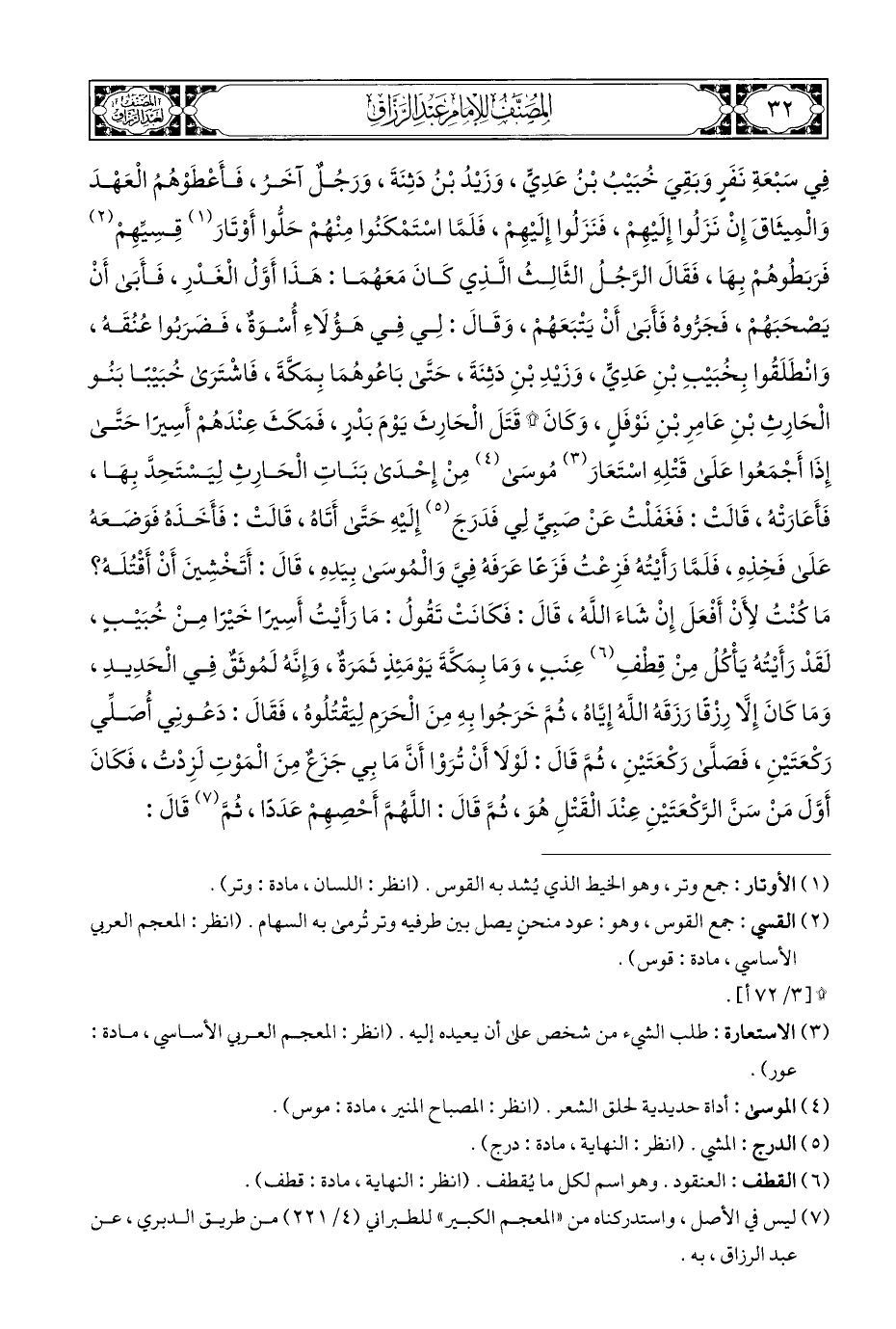 فِي سَبْعَةِ نَفَرٍ وَبَقِيَ خُبَيْبُ بْنُ عَدِيٍّ، وَزَيْدُ بْنُ دَثِنَةَ، وَرَجُلٌ آخَرُ، فَأَعْطَوْهُمُ الْعَهْدَ وَالْمِيثَاقَ إِنْ نَزَلُوا إِلَيْهِمْ، فَنَزَلُوا إِلَيْهِمْ، فَلَمَّا اسْتَمْكَنُوا مِنْهُمْ حَلُّوا أَوْتَارَ (¬١) قِسِيِّهِمْ (¬٢) فَرَبَطُوهُمْ بِهَا، فَقَالَ الرَّجُلُ الثَّالِثُ الَّذِي كَانَ مَعَهُمَا: هَذَا أَوَّلُ الْغَدْرِ، فَأَبَى أَنْ يَصْحَبَهُمْ، فَجَرُّوهُ فَأَبَى أَنْ يَتْبَعَهُمْ، وَقَالَ: لِي فِي هَؤُلَاءِ أُسْوَةٌ، فَضَرَبُوا عُنُقَهُ، وَانْطَلَقُوا بِخُبَيْبِ بْنِ عَدِيٍّ، وَزَيْدِ بْنِ دَثِنَةَ، حَتَّى بَاعُوهُمَا بِمَكَّةَ، فَاشْتَرَى خُبَيْبًا بَنُو الْحَارِثِ بْنِ عَامِرِ بْنِ نَوْفَلٍ، وَكَانَ (*) قَتَلَ الْحَارِثَ يَوْمَ بَدْرٍ، فَمَكَثَ عِنْدَهُمْ أَسِيرًا حَتَّى إِذَا أَجْمَعُوا عَلَى قَتْلِهِ اسْتَعَارَ (¬٣) مُوسَى (¬٤) مِنْ إِحْدَى بَنَاتِ الْحَارِثِ لِيَسْتَحِدَّ بِهَا، فَأَعَارَتْهُ، قَالَتْ: فَغَفَلْتُ عَنْ صبِيٍّ لِي فَدَرَجَ (¬٥) إِلَيْهِ حَتَّى أَتَاهُ، قَالَتْ: فَأَخَذَهُ فَوَضَعَهُ عَلَى فَخِذِهِ، فَلَمَّا رَأَيْتُهُ فَزِعْتُ فَزَعًا عَرَفَهُ فِيَّ وَالْمُوسَى بِيَدِهِ، قَالَ: أَتَخْشِينَ أَنْ أَقْتُلَهُ؟ مَا كُنْتُ لِأَنْ أَفْعَلَ إِنْ شَاءَ اللهُ، قَالَ: فَكَانَتْ تَقُولُ: مَا رَأَيْتُ أَسِيرًا خَيْرًا مِنْ خُبَيْبٍ، لَقَدْ رَأَيْتُهُ يَأْكُلُ مِنْ قِطْفِ (¬٦) عِنَبٍ، وَمَا بِمَكَّةَ يَوْمَئِذٍ ثَمَرَةٌ، وإِنَّهُ لَمُوثَقٌ فِي الْحَدِيدِ، وَمَا كَانَ إِلَّا رِزْقًا رَزَقَهُ اللهُ إِيَّاهُ، ثُمَّ خَرَجُوا بِهِ مِنَ الْحَرَمِ لِيَقْتُلُوهُ، فَقَالَ: دَعُونِي أُصَلِّي رَكْعَتَيْنِ، فَصَلَّى رَكْعَتَيْنِ، ثُمَّ قَالَ: لَوْلَا أَنْ تُرَوْا أَنَّ مَا بِي جَزَعٌ مِنَ الْمَوْتِ لَزِدْتُ، فَكَانَ أَوَّلَ مَنْ سَنَّ الرَّكْعَتَيْنِ عِنْدَ الْقَتْلِ هُوَ، ثُمَّ قَالَ: اللَّهُمَّ أَحْصهِمْ عَدَدًا، ثُمَّ (¬٧) قَالَ: