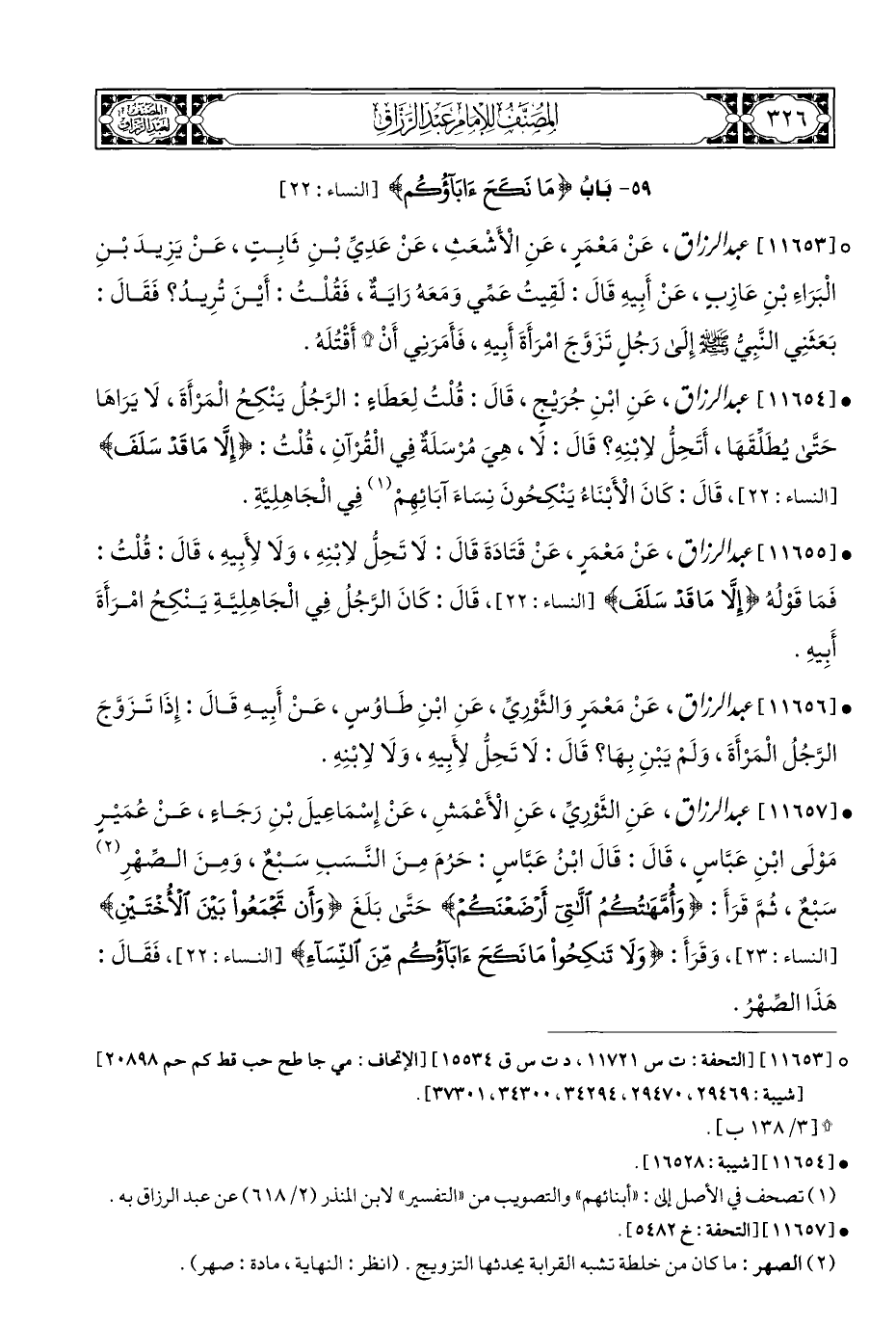 • [١١٦٥٧] عبد الرزاق، عَنِ الثَّوْرِيِّ، عَنِ الْأَعْمَشِ، عَنْ إِسْمَاعِيلَ بْنِ رَجَاءٍ، عَنْ عُمَيْرٍ مَوْلَى ابْنِ عَبَّاسٍ، قَالَ: قَالَ ابْنُ عَبَّاسٍ: حَرُمَ مِنَ النَّسَبِ سَبْعٌ، وَمِنَ الصِّهْرِ (¬٢) سَبْعٌ، ثُمَّ قَرَأَ: {وَأُمَّهَاتُكُمُ اللَّاتِي أَرْضَعْنَكُمْ} حَتَّى بَلَغَ {وَأَنْ تَجْمَعُوا بَيْنَ الْأُخْتَيْنِ} [النساء: ٢٣]، وَقَرَأَ: {وَلَا تَنْكِحُوا مَا نَكَحَ آبَاؤُكُمْ مِنَ النِّسَاءِ} [النساء: ٢٢]، فَقَالَ: هَذَا الصِّهْرُ.