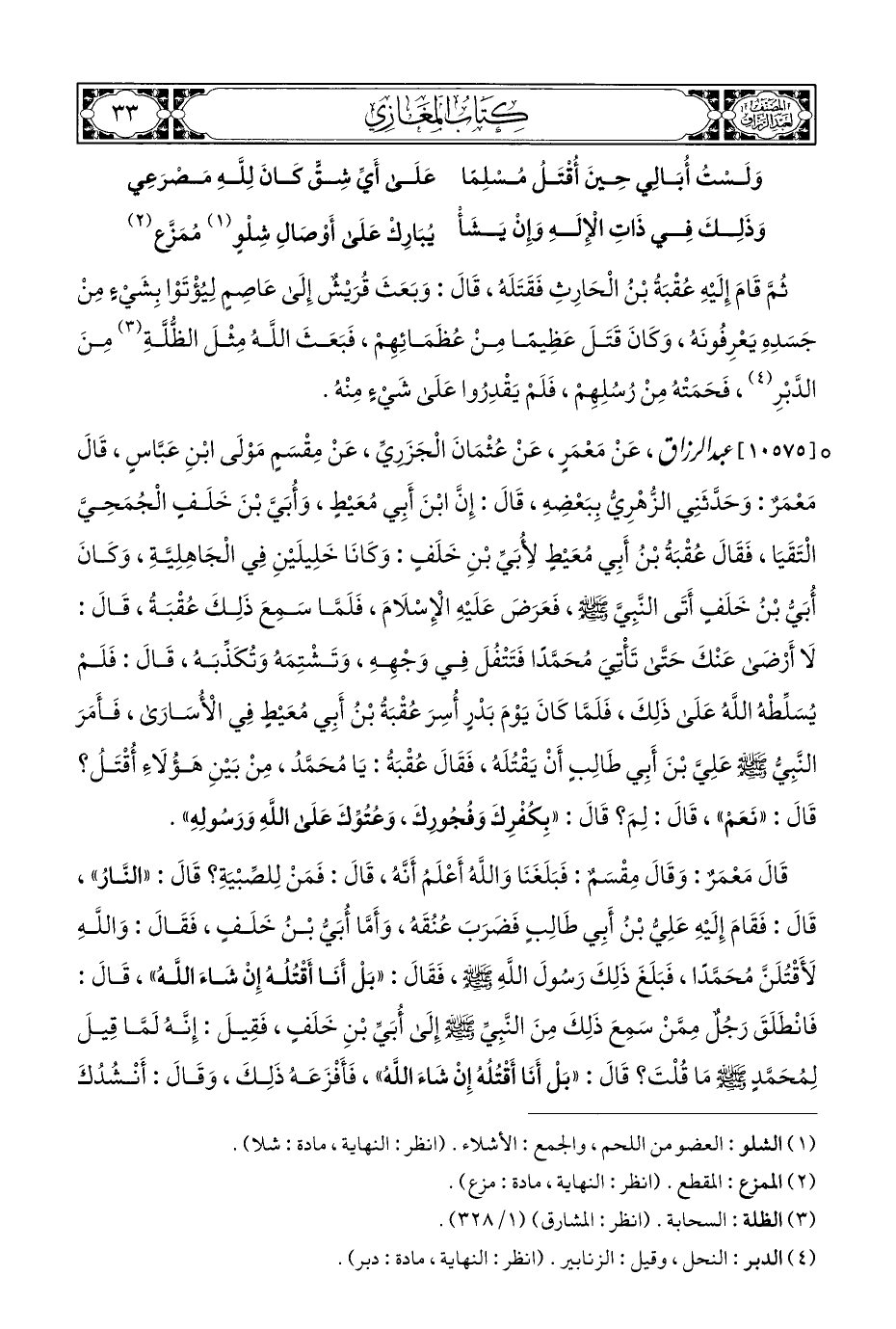 ° [١٠٥٧٥] عبد الرزاق، عَنْ مَعْمَرٍ، عَنْ عُثْمَانَ الْجَزَرِيِّ، عَنْ مِقْسَمٍ مَوْلَى ابْنِ عَبَّاسٍ، قَالَ مَعْمَرٌ: وَحَدَّثَنِي الزُّهْرِيُّ بِبَعْضِهِ، قالَ: إِنَّ ابْنَ أَبِي مُعَيْطٍ، وَأُبَيَّ بْنَ خَلَفٍ الْجُمَحِيَّ الْتَقَيَا، فَقَالَ عُقْبَةُ بْنُ أَبِي مُعَيْطٍ لِأُبَيِّ بْنِ خَلَفٍ: وَكَانَا خَلِيلَيْنِ فِي الْجَاهِلِيَّةِ، وَكَانَ أُبَيُّ بْنُ خَلَفٍ أَتَى النَّبِيَّ - صلى الله عليه وسلم -، فَعَرَضَ عَلَيْهِ الْإِسْلَامَ، فَلَمَّا سَمِعَ ذَلِكَ عُقْبَةُ، قَالَ: لَا أَرْضى عَنْكَ حَتَّى تَأْتيَ مُحَمَّدًا فَتَتْفُلَ فِي وَجْهِهِ، وَتَشْتِمَهُ وَتُكَذِّبَهُ، قَالَ: فَلَمْ يُسَلِّطْهُ اللهُ عَلَى ذَلِكَ، فَلَمَّا كَانَ يَوْمَ بَدْرٍ أُسِرَ عُقْبَةُ بْنُ أَبِي مُعَيْطٍ فِي الْأُسَارَى، فَأَمَرَ النَّبِيُّ - صلى الله عليه وسلم - علِيَّ بْنَ أَبِي طَالِبٍ أَنْ يَقْتُلَهُ، فَقَالَ عُقْبَةُ: يَا مُحَمَّدُ، مِنْ بَيْنِ هَؤُلَاءِ أُقْتَلُ؟ قَالَ: "نَعَمْ"، قَالَ: لِمَ؟ قَالَ: "بِكُفْرِكَ وَفُجُورِكَ، وَعُتُوِّكَ عَلَى اللهِ وَرَسُولِهِ".