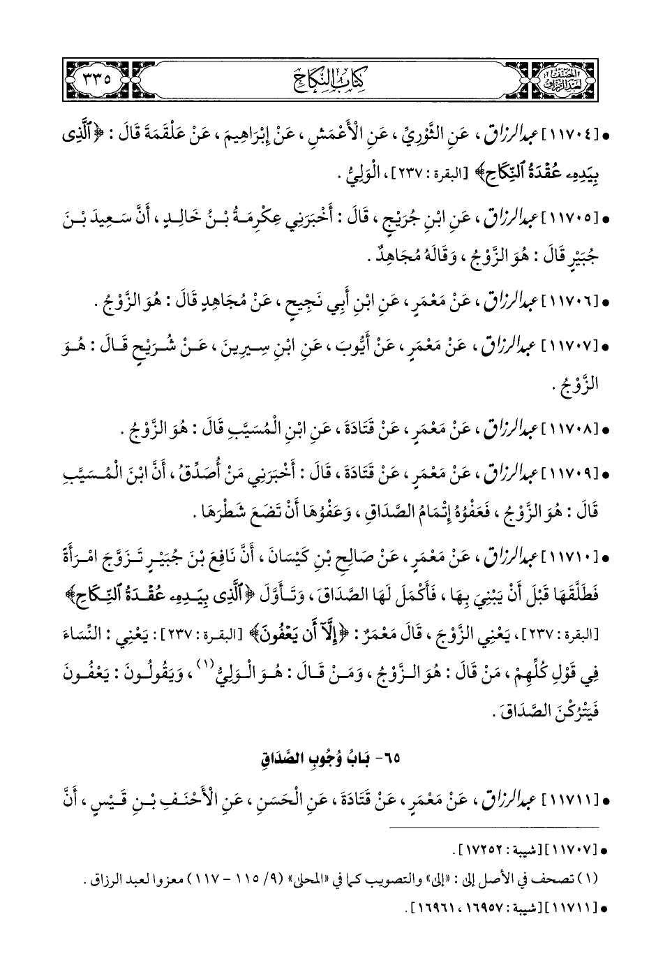 • [١١٧١٠] عبد الرزاق، عَنْ مَعْمَرٍ، عَنْ صَالِحِ بْنِ كَيْسَانَ، أَنَّ نَافِعَ بْنَ جُبَيْرٍ تَزَوَّجَ امْرَأَةً فَطَلَّقَهَا قَبْلَ أَنْ يَبْنِيَ بِهَا، فَأَكْمَلَ لَهَا الصَّدَاقَ، وَتَأَوَّلَ {الَّذِي بِيَدِهِ عُقْدَةُ النِّكَاحِ} [البقرة: ٢٣٧]، يَعْنِي الزَّوْجَ، قَالَ مَعْمَرٌ: {إِلَّا أَنْ يَعْفُونَ} [البقرة: ٢٣٧]: يَعْنِي: النِّسَاءَ فِي قَوْلِ كُلِّهِمْ، مَنْ قَالَ: هُوَ الزَّوْجُ، وَمَنْ قَالَ: هُوَ الْوَلِيُّ (¬١)، وَيَقُولُونَ: يَعْفُونَ فَيَتْرُكْنَ الصَّدَاقَ.