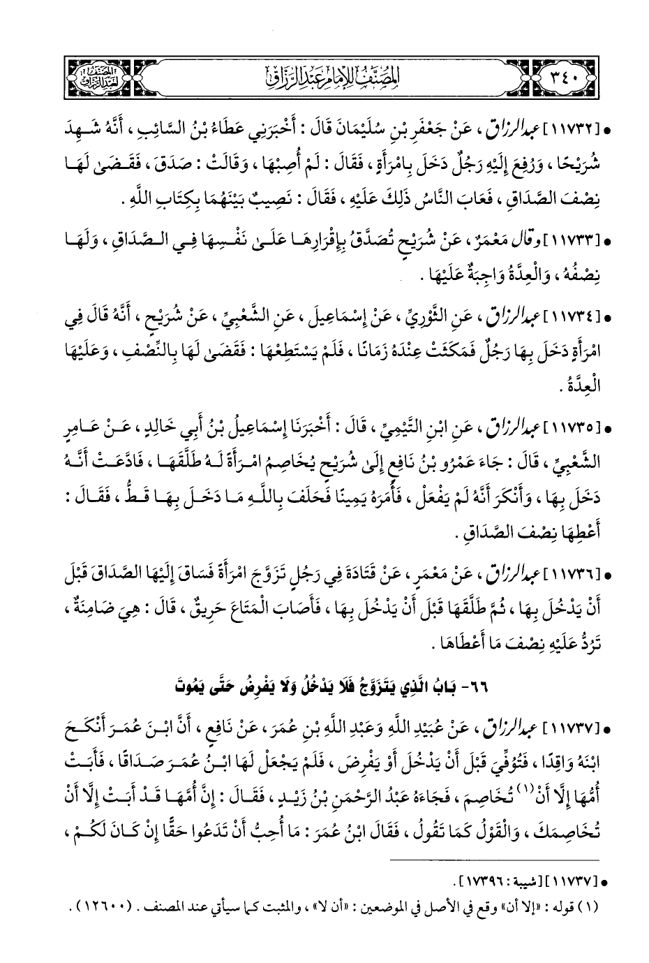 • [١١٧٣٧] عبد الرزاق، عَنْ عُبَيْدِ اللَّهِ وَعَبْدِ اللَّهِ بْنِ عُمَرَ، عَنْ نَافِعٍ، أَنَّ ابْنَ عُمَرَ أَنْكَحَ ابْنَهُ وَاقِدًا، فَتُوُفِّيَ قَبْلَ أَنْ يَدْخُلَ أَوْ يَفْرِضَ، فَلَمْ يَجْعَلْ لَهَا ابْنُ عُمَرَ صَدَاقًا، فَأَبَتْ أُمُّهَا إِلَّا أَنْ (¬١) تُخَاصِمَ، فَجَاءَهُ عَبْدُ الرَّحْمَنِ بْنُ زَيْدٍ، فَقَالَ: إِنَّ أُمَّهَا قَدْ أَبَتْ إِلَّا أَنْ تُخَاصِمَكَ، وَالْقَوْلُ كَمَا تَقُولُ، فَقَالَ ابْنُ عُمَرَ: مَا أُحِبُّ أَنْ تَدَعُوا حَقًّا إِنْ كَانَ لكمْ،