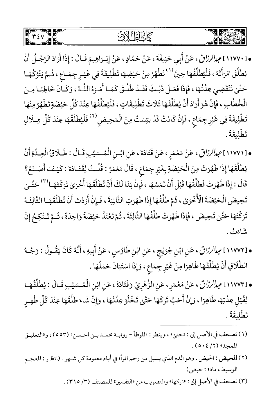 • [١١٧٧١] عبد الرزاق، عَنْ مَعْمَرٍ، عَنْ قَتَادَةَ، عَنِ ابْنِ الْمُسَيَّبِ قَالَ: طَلَاقُ الْعِدُّةِ أَنْ يُطَلِّقَهَا إِذَا طَهُرَتْ مِنَ الْحَيْضَةِ بِغَيْرِ جِمَاعٍ، قَالَ مَعْمَرٌ: قُلْتُ لِقَتَادَةَ: كَيْفَ أَصنَعُ؟ قَالَ: إِذَا طَهُرَتْ فَطَلِّقْهَا قَبْلَ أَنْ تَمَسَّهَا، فَإِنْ بَدَا لَكَ أَنْ تُطَلِّقَهَا أُخْرَى تَرَكْتَهَا (¬٣) حَتَّى تَحِيضَ الْحَيْضَةَ الْأُخْرَى، ثُمَّ طَلِّقْهَا إِذَا طَهُرَتِ الثَّانِيَةَ، فَإِنْ أَرَدْتَ أَنْ تُطَلِّقَهَا الثَّالِثَةَ تَرَكْتَهَا حَتَّى تَحِيضَ، فَإِذَا طَهُرَتْ طَلِّقْهَا الثَّالِثَةَ، ثُمَّ تَعْتَدُّ حَيْضَةً وَاحِدَةً، ثُمَّ تَنْكِحُ إِنْ شَاءَتْ.