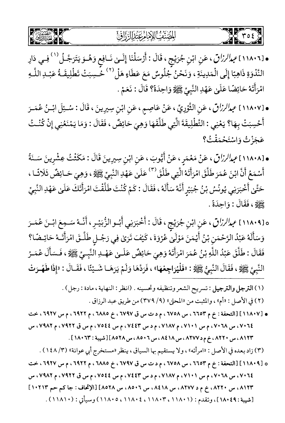 ° [١١٨٠٩] عبد الرزاق، عَنِ ابْنِ جُرَيْجٍ، قَالَ: أَخْبَرَنِي أَبُو الزُّبَيْرِ، أَنَّهُ سَمِعَ ابْنَ عُمَرَ وَسَأَلَهُ عَبْدُ الرَّحْمَنِ بْنُ أَيْمَنَ مَوْلَى عُرْوَةَ، كَيْفَ تَرَى فِي رَجُلٍ طَلَّقَ امْرَأَتَهُ حَائِضًا؟ فَقَالَ: طَلَّقَ عَبْدُ اللَّهِ بْنُ عُمَرَ امْرَأَتَهُ وَهِيَ حَائِضٌ عَلَى عَهْدِ النَّبِيِّ - صلى الله عليه وسلم -، فَسَأَلَ عُمَرُ النَّبِيَّ - صلى الله عليه وسلم -، فَقَالَ النَّبِي - صلى الله عليه وسلم -: "فَلْيُرَاجِعْهَا"، فَرَدَّهَا وَلَمْ يَرَهَا شَيْئًا، فَقَالَ: "إِذَا طَهُرَتْ