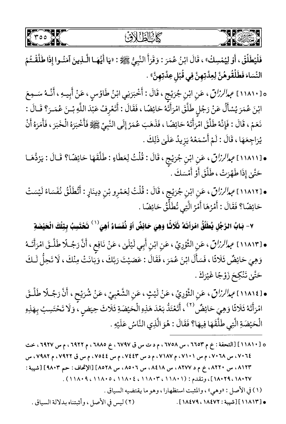 ° [١١٨١٠] عبد الرزاق، عَنِ ابْنِ جُرَيْجٍ، قَالَ: أَخْبَرَنِي ابْنُ طَاوُسٍ، عَنْ أَبِيهِ، أَنَّهُ سَمِعَ ابْنَ عُمَرَ يُسْأَلُ عَنْ رَجُلٍ طَلَّقَ امْرَأَتَهُ حَائِضًا، فَقَالَ: أَتَعْرِفُ عَبْدَ اللَّهِ بْنَ عُمَرَ؟ قَالَ: نَعَمْ، قَالَ: فَإِنَّهُ طَلَّقَ امْرَأَتَهُ حَائِضًا، فَذَهَبَ عُمَرُ إِلَى النَّبِيِّ - صلى الله عليه وسلم - فَأَخْبَرَهُ الْخَبَرَ، فَأَمَرَهُ أَنْ يُرَاجِعَهَا، قَالَ: لَمْ أَسْمَعْهُ يَزِيدُ عَلَى ذَلِكَ.