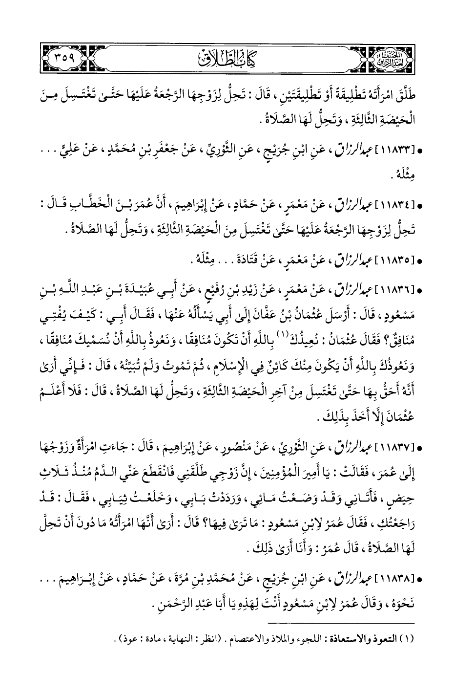 • [١١٨٣٦] عبد الرزاق، عَنْ مَعْمَرٍ، عَنْ زَيْدِ بْنِ رُفَيْعٍ، عَنْ أَبِي عُبَيْدَةَ بْنِ عَبْدِ اللَّهِ بْنِ مَسْعُودٍ، قَالَ: أَرْسَلَ عُثْمَانُ بْنُ عَفَّانَ إِلَى أَبِي يَسْأَلُهُ عَنْهَا، فَقَالَ أَبِي: كَيْفَ يُفْتِي مُنَافِقٌ؟ فَقَالَ عُثْمَانُ: نُعِيذُكَ (¬١) بِاللَّهِ أَنْ تَكُونَ مُنَافِقًا، وَنَعُوذُ بِاللَّهِ أَنْ نُسَمِّيكَ مُنَافِقًا، وَنَعُوذُكَ بِاللَّهِ أَنْ يَكُونَ مِنْكَ كَائِنٌ فِي الْإِسْلَامِ، ثُمَّ تَمُوتُ وَلَمْ تُبَيِّنْهُ، قَالَ: فَإِنِّي أَرَى أَنَّهُ أَحَقُّ بِهَا حَتَّى تَغْتَسِلَ مِنْ آخِرِ الْحَيْضَةِ الثَّالِثَةِ، وَتَحِلُّ لَهَا الصَّلَاةُ، قَالَ: فَلَا أَعْلَمُ عُثْمَانَ إِلَّا أَخَذَ بِذَلِكَ.