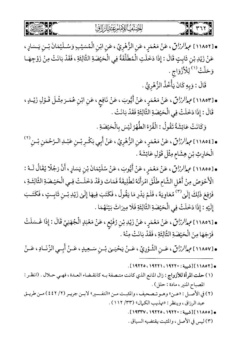 • [١١٨٥٢] عبد الرزاق، عَنْ مَعْمَرٍ، عَنِ الزُّهْرِيِّ، عَنِ ابْنِ الْمُسَيَّبِ وَسُلَيْمَانَ بْنِ يَسَارٍ، عَنْ زَيْدِ بْنِ ثَابِتٍ قَالَ: إِذَا دَخَلَتِ الْمُطَلَّقَةُ فِي الْحَيْضَةِ الثالِثَةِ، فَقَدْ بَانَتْ مِنْ زَوْجِهَا وَحَلَّتْ (¬١) لِلْأَزْوَاجِ.