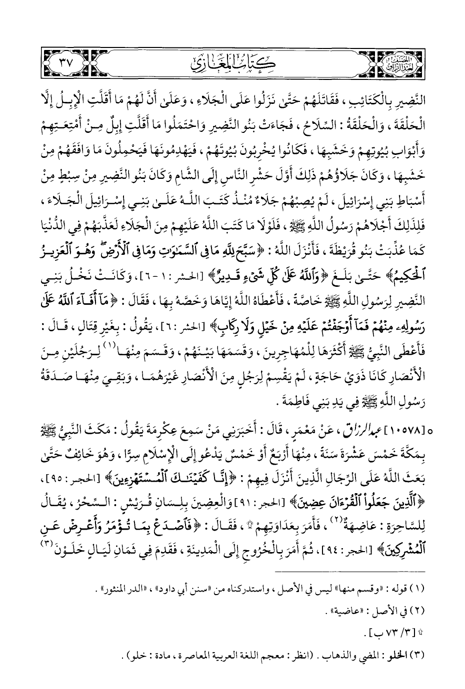 النَّضيرِ بِالْكَتَائِبِ، فَقَاتَلَهُمْ حَتَّى نَزَلُوا عَلَى الْجَلَاءِ، وَعَلَى أَنَّ لَهُمْ مَا أَقَلَّتِ الْإِبِلُ إِلَّا الْحَلْقَةَ، وَالْحَلْقَةُ: السِّلَاحُ، فَجَاءَتْ بَنُو النَّضِيرِ وَاحْتَمَلُوا مَا أَقَلَّتِ إِبِلٌ مِنْ أَمْتِعَتِهِمْ وَأَبْوَابِ بُيُوتِهِمْ وَخَشَبِهَا، فَكَانُوا يُخْرِبُونَ بُيُوتَهُمْ، فَيَهْدِمُونَهَا فَيَحْمِلُونَ مَا وَافَقَهُمْ مِنْ خَشَبِهَا، وَكَانَ جَلَاؤُهُمْ ذَلِكَ أَوَّلَ حَشْرِ النَّاسِ إِلَى الشَّامِ وَكَانَ بَنُو النَّضِيرِ مِنْ سِبْطٍ مِنْ أَسْبَاطِ بَنِي إِسْرَائِيلَ، لَمْ يُصِبْهُمْ جَلَاءٌ مُنْذُ كَتَبَ اللهُ عَلَى بَنِي إِسْرَائِيلَ الْجَلَاءَ، فَلِذَلِكَ أَجْلَاهُمْ رَسُولُ اللهِ - صلى الله عليه وسلم -، فَلَوْلَا مَا كَتَبَ اللهُ عَلَيْهِمْ مِنَ الْجَلَاءِ لَعَذَّبَهُمْ فِي الدُّنْيَا كَمَا عُذِّبَتْ بَنُو قُرَيْظَةَ، فَأَنْزَلَ اللهُ: {سَبَّحَ لِلَّهِ مَا فِي السَّمَاوَاتِ وَمَا فِي الْأَرْضِ وَهُوَ الْعَزِيزُ الْحَكِيمُ} حَتَّى بَلَغَ {وَاللَّهُ عَلَى كُلِّ شَيْءٍ قَدِيرٌ} [الحشر: ١ - ٦]، وَكَانَتْ نَخْلُ بَنِي النَّضِيرِ لِرَسُولِ اللهِ - صلى الله عليه وسلم - خَاصَّةً، فَأَعْطَاهُ اللهُ إِيَّاهَا وَخَصَّهُ بِهَا، فَقَالَ: {وَمَا أَفَاءَ اللَّهُ عَلَى رَسُولِهِ مِنْهُمْ فَمَا أَوْجَفْتُمْ عَلَيْهِ مِنْ خَيْلٍ وَلَا رِكَابٍ} [الحشر: ٦]، يَقُولُ: بِغَيْرِ قِتَالٍ، قَالَ: فَأَعْطَى النَّبِيُّ - صلى الله عليه وسلم - أَكْثَرَهَا لِلْمُهَاجِرِينَ، وَقَسَمَهَا بَيْنَهُمْ، وَقَسَمَ مِنْهَا (¬١) لِرَجُلَيْنِ مِنَ الْأَنْصارِ كَانَا ذَوَيْ حَاجَةٍ، لَمْ يَقْسِمْ لِرَجُلٍ مِنَ الْأَنْصَارِ غَيْرَهُمَا، وَبَقِيَ مِنْهَا صدَقَةُ رَسُولِ اللهِ - صلى الله عليه وسلم - فِي يَدِ بَنِي فَاطِمَةَ.