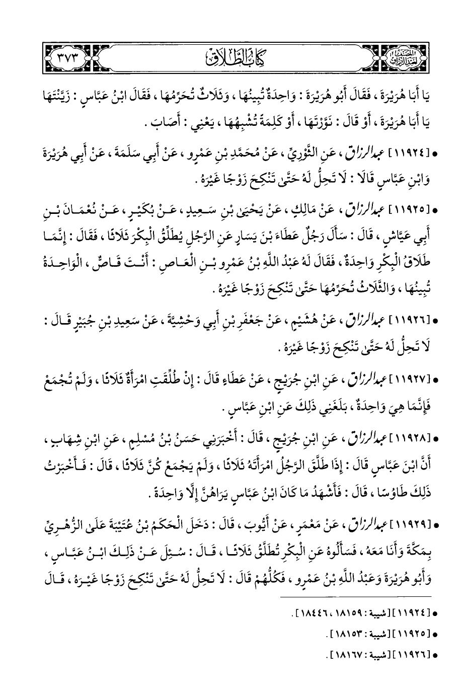 • [١١٩٢٩] عبد الرزاق، عَنْ مَعْمَرٍ، عَنْ أَيُّوبَ، قَالَ: دَخَلَ الْحَكَمُ بْنُ عُتَيْبَةَ عَلَى الزُّهْرِيِّ بِمَكَّةَ وَأَنَا مَعَهُ، فَسَأَلُوهُ عَنِ الْبِكْرِ تُطَلَّقُ ثَلَاثًا، قَالَ: سُئِلَ عَنْ ذَلِكَ ابْنُ عَبَّاسٍ، وَأَبُو هُرَيْرَةَ وَعَبْدُ اللَّهِ بْنُ عَمْرٍو، فَكُلُّهُمْ قَالَ: لَا تَحِلُّ لَهُ حَتَّى تَنْكِحَ زَوْجًا غَيْرَهُ، قَالَ