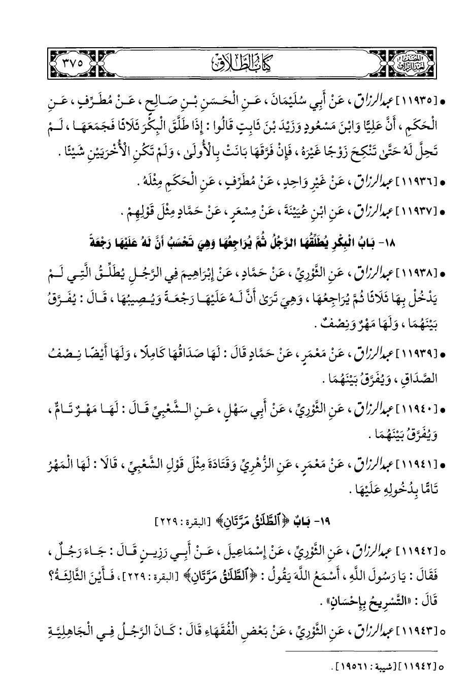 ° [١١٩٤٢] عبد الرزاق، عَنِ الثَّوْريِّ، عَنْ إِسْمَاعِيلَ، عَن أَبِي رَزِينٍ قَالَ: جَاءَ رَجُلٌ، فَقَالَ: يَا رَسُولَ اللَّهِ، أَسْمَعُ اللهَ يَقُولُ: {الطَّلَاقُ مَرَّتَانِ} [البقرة: ٢٢٩]، فَأَيْنَ الثَّالِثَةُ؟ قَالَ: "التَّسْرِيحُ بِإِحْسَانِ".