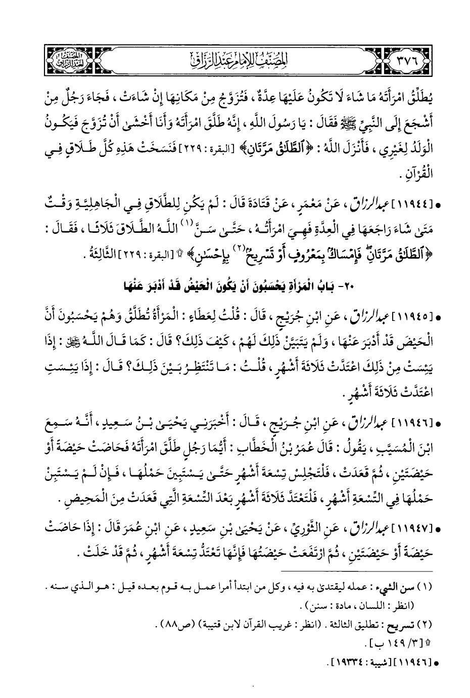 • [١١٩٤٤] عبد الرزاق، عَنْ مَعْمَرٍ، عَنْ قَتَادَةَ قَالَ: لَمْ يَكُنِ لِلطَّلَاقِ فِي الْجَاهِلِيَّةِ وَقْت مَتَى شَاءَ رَاجَعَهَا فِي الْعِدَّةِ فَهِيَ امْرَأَتُهُ، حَتَّى سَنَّ (¬١) اللهُ الطُّلَاقَ ثَلَاثًا، فَقَالَ: {الطَّلَاقُ مَرَّتَانِ فَإِمْسَاكٌ بِمَعْرُوفٍ أَوْ تَسْرِيحٌ (¬٢) بِإِحْسَانٍ} * [البقرة: ٢٢٩]، الثَّالِثَةُ.