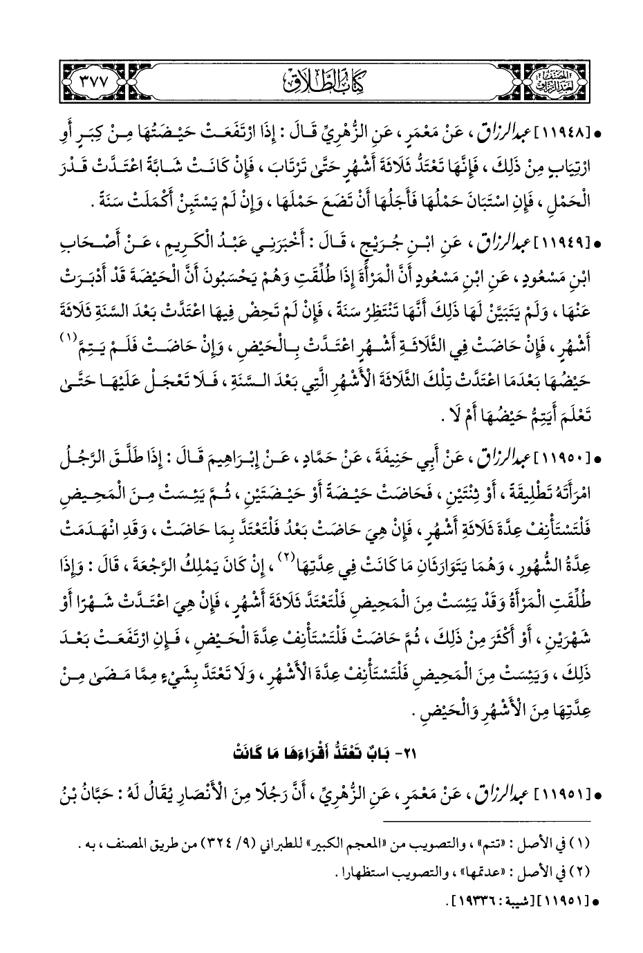 • [١١٩٤٩] عبد الرزاق، عَنِ ابْنِ جُرَيْجٍ، قَالَ: أَخْبَرَنِي عَبْدُ الْكَرِيمِ، عَنْ أَصْحَابِ ابْنِ مَسْعُودٍ، عَنِ ابْنِ مَسْعُودٍ أَنَّ الْمَرْأَةَ إِذَا طُلِّقَتِ وَهُمْ يَحْسَبُونَ أَنَّ الْحَيْضةَ قَدْ أَدْبَرَتْ عَنْهَا، وَلَمْ يَتَبَيَّنْ لَهَا ذَلِكَ أَنَّهَا تَنْتَظِرُ سَنَةً، فَإِنْ لَمْ تَحِضْ فِيهَا اعْتَدَّتْ بَعْدَ السَّنَةِ ثَلَاثَةَ أَشْهُرٍ، فَإِنْ حَاضَتْ فِي الثَّلَاثَةِ أَشْهُرٍ اعْتَدَّتْ بِالْحَيْضِ، وإِنْ حَاضَتْ فَلَمْ يَتِمَّ (¬١) حَيْضُهَا بَعْدَمَا اعْتَدَّتْ تِلْكَ الثلَاثَةَ الْأَشْهُرِ الَّتِي بَعْدَ السَّنَةِ، فَلَا تَعْجَلْ عَلَيْهَا حَتَّى تَعْلَمَ أَيَتِمُّ حَيْضُهَا أَمْ لَا.