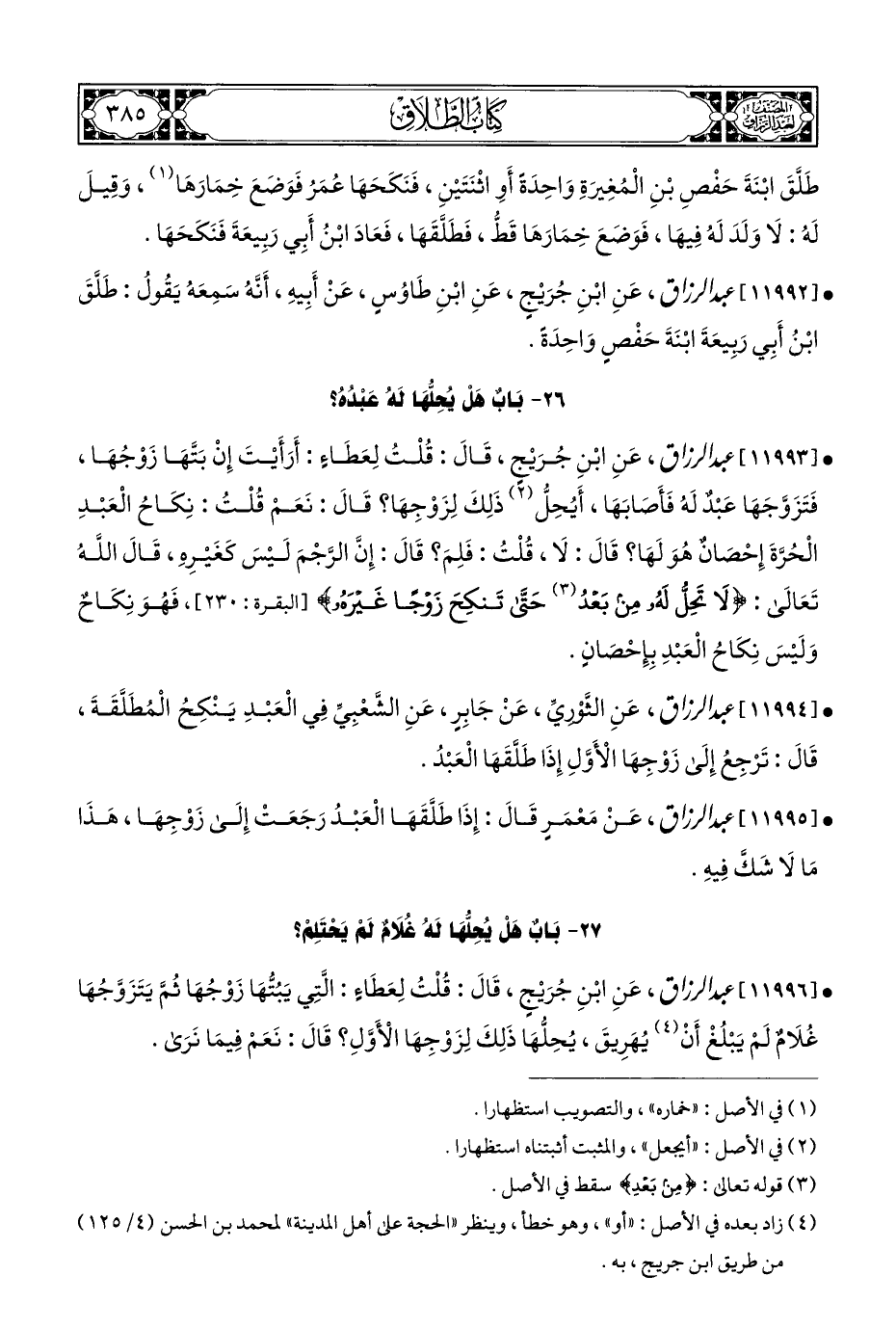 • [١١٩٩٥] عبد الرزاق، عَنْ مَعْمَرٍ قَالَ: إِذَا طَلَّقَهَا الْعَبْدُ رَجَعَتْ إِلَى زَوْجِهَا، هَذَا مَا لَا شَكَّ فِيهِ.