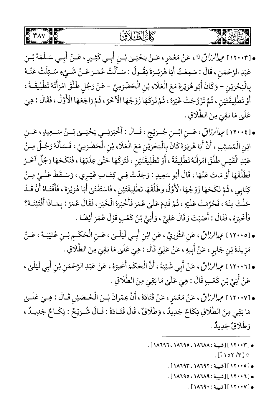 • [١٢٠٠٤] عبد الرزاق، عَنِ ابْنِ جُرَيْجٍ، قَالَ: أَخْبَرَنِي يَحْيَى بْنُ سَعِيدٍ، عَنِ ابْنِ الْمُسَيَّبِ، أَنَّ أَبَا هُرَيْرَةَ كَانَ بِالْبَحْرَيْنِ مَعَ الْعَلَاءِ بْنِ الْحَضْرَمِيِّ، فَسَأَلَهُ رَجُلٌ مِنْ عَبْدِ الْقَيْسِ طَلَّقَ امْرَأَتَهُ تَطْلِيقَةً، أَوْ تَطْلِيقَتَيْنِ، فَتَرَكَهَا حَتَّى عِدَّتِهَا، فَنَكَحَهَا رَجُلٌ آخَرُ فَطَلَّقَهَا أَوْ مَاتَ عَنْهَا، قَالَ أَبُو سَعِيدٍ: وَجَدْتُ فِي كِتَابِ غَيْرِي، وَسَقَطَ عَلَيَّ مِنْ كِتَابِي، ثُمَّ نَكَحَهَا زَوْجُهَا الْأَوَّلُ وَطَلَّقَهَا تَطْلِيقَتَيْنِ، فَاسْتَفْتَى أَبَا هُرَيْرَةَ، فَأَفْتَاهُ أَنْ قَدْ حَلَّتْ مِنْهُ، فَحُرِّمَتْ عَلَيْهِ، ثُمَّ قَدِمَ عَلَى عُمَرَ فَأَخْبَرَهُ الْخَبَرَ، فَقَالَ عُمَرُ: بِمَاذَا أَفْتَيْتَهُ؟ فَأَخْبَرَهُ، فَقَالَ: أَصَبْتَ وَقَالَ عَلِيٌّ، وَأُبَيُّ بْنُ كَعْبٍ قَوْلَ عُمَرَ أَيْضًا.