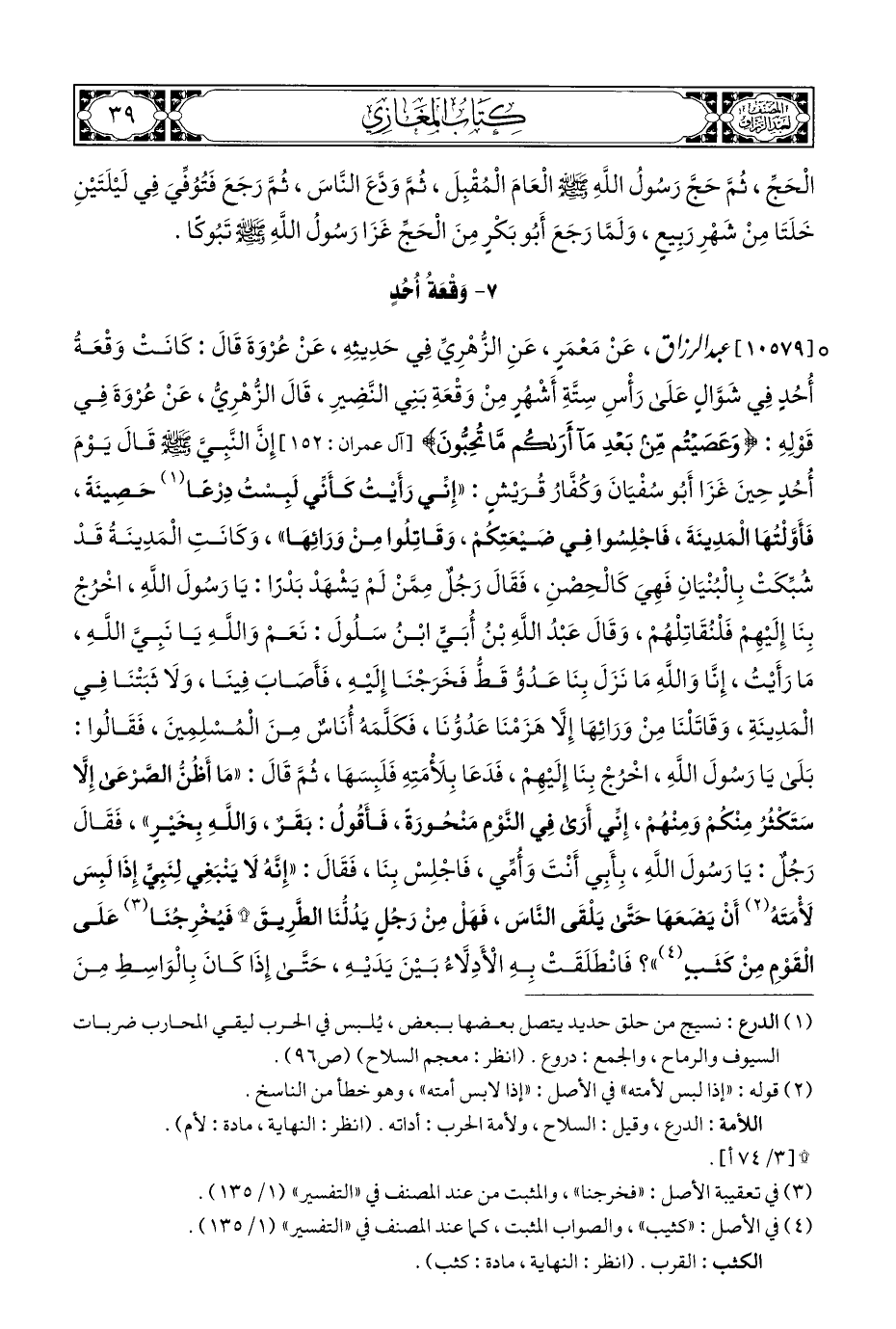 ° [١٠٥٧٩] عبد الرزاق، عَنْ مَعْمَرٍ، عَنِ الزُّهْرِيِّ فِي حَدِيثِهِ، عَنْ عُرْوَةَ قَالَ: كَانَتْ وَقْعَةُ أُحُدٍ فِي شَوَّالٍ عَلَى رَأْسِ سِتَّةِ أَشْهُرٍ مِنْ وَقْعَةِ بَنِي النَّضِيرِ، قَالَ الزُّهْرِيُّ، عَنْ عُرْوَةَ فِي قَوْلِهِ: {وَعَصَيْتُمْ مِنْ بَعْدِ مَا أَرَاكُمْ مَا تُحِبُّونَ} [آل عمران: ١٥٢] إِنَّ النَّبِيَّ - صلى الله عليه وسلم - قالَ يَوْمَ أُحُدٍ حِينَ غَزَا أَبُو سُفْيَانَ وَكُفَّارُ قُرَيْشٍ: "إِنِّي رَأَيْتُ كَأَنِّي لَبِسْتُ دِرْعًا (¬١) حَصِينَةً، فَأَوَّلْتُهَا الْمَدِينَةَ، فَاجْلِسُوا فِي ضَيْعَتِكُمْ، وَقَاتِلُوا مِنْ وَرَائِهَا"، وَكَانَتِ الْمَدِينَةُ قَدْ شُبِّكَتْ بِالْبُنْيَانِ فَهِيَ كَالْحِصْنِ، فَقَالَ رَجُلٌ مِمَّنْ لَمْ يَشْهَدْ بَدْرًا: يَا رَسُولَ اللهِ، اخْرُجْ بِنَا إِلَيْهِمْ فَلْنُقَاتِلْهُمْ، وَقَالَ عَبْدُ اللهِ بْنُ أُبَيٍّ ابْنُ سَلُولَ: نَعَمْ وَاللهِ يَا نَبِيَّ اللهِ، مَا رَأَيْتُ، إِنَّا وَاللهِ مَا نَزَلَ بِنَا عَدُوُّ قَطُّ فَخَرَجْنَا إِلَيْهِ، فَأَصَابَ فِينَا، وَلَا ثَبَتْنَا فِي الْمَدِينَةِ، وَقَاتَلْنَا مِنْ وَرَائِهَا إِلَّا هَزَمْنَا عَدُوُّنَا، فَكَلَّمَهُ أُنَاسٌ مِنَ الْمُسْلِمِينَ، فَقَالُوا: بَلَى يَا رَسُولَ اللهِ، اخْرُجْ بِنَا إِلَيْهِمْ، فَدَعَا بِلأْمَتِهِ فَلَبِسَهَا، ثُمَّ قَالَ: "مَا أَظُنُّ الصَّرْعَى إِلَّا سَتَكْثُرُ مِنْكُمْ وَمِنْهُمْ، إِنِّي أَرَى فِي النَّوْمِ مَنْحُورَةً، فَأَقُولُ: بَقَرٌ، وَاللهِ بِخَيْرٍ"، فَقَالَ رَجُلٌ: يَا رَسُولَ اللهِ، بِأَبِي أَنْتَ وَأُمِّي، فَاجْلِسْ بِنَا، فَقَالَ: "إِنَّهُ لَا يَنْبَغِي لِنَبِيٍّ إِذَا لَبِسَ لأْمَتَهُ (¬٢) أَنْ يَضَعَهَا حَتَّى يَلْقَى النَّاسَ، فَهَلْ مِنْ رَجُلٍ يَدُلُّنَا الطَّرِيقَ (*) فَيُخْرِجُنَا (¬٣) عَلَى الْقَوْمِ مِنْ كَثَبٍ (¬٤) "؟ فَانْطَلَقَتْ بِهِ الْأَدِلَّاءُ بَيْنَ يَدَيْهِ، حَتَّى إِذَا كَانَ بِالْوَاسِطِ مِنَ