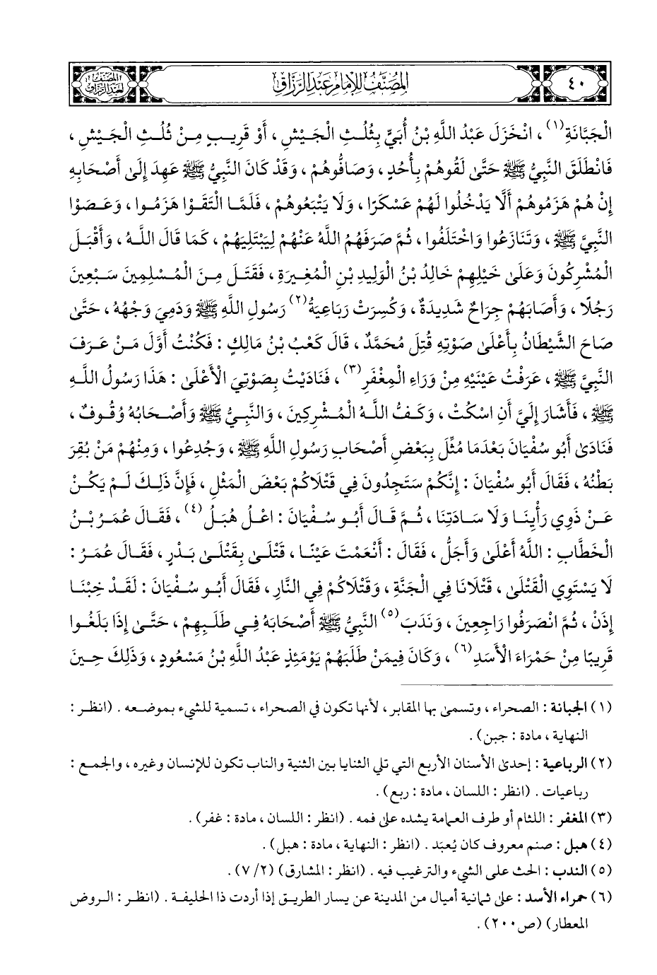 الْجَبَّانَةِ (¬١)، انْخَزَلَ عَبْدُ اللهِ بْنُ أُبَيٍّ بِثُلُثِ الْجَيْشِ، أَوْ قَرِيبٍ مِنْ ثُلُثِ الْجَيْشِ، فَانْطَلَقَ النَّبِيُّ - صلى الله عليه وسلم - حَتَّى لَقُوهُمْ بِأُحُدٍ، وَصَافُّوهُمْ، وَقَدْ كَانَ النَّبِيُّ - صلى الله عليه وسلم - عَهِدَ إِلَى أَصْحَابِهِ إِنْ هُمْ هَزَمُوهُمْ أَلَّا يَدْخُلُوا لَهُمْ عَسْكَرًا، وَلَا يَتْبَعُوهُمْ، فَلَمَّا الْتَقَوْا هَزَمُوا، وَعَصَوْا النَّبِيَّ - صلى الله عليه وسلم -، وَتَنَازَعُوا وَاخْتَلَفُوا، ثُمَّ صَرَفَهُمُ اللهُ عَنْهُمْ لِيَبْتَلِيَهُمْ، كَمَا قَالَ اللهُ، وَأَقْبَلَ الْمُشْرِكُونَ وَعَلَى خَيْلِهِمْ خَالِدُ بْنُ الْوَلِيدِ بْنِ الْمُغِيرَةِ، فَقَتَلَ مِنَ الْمُسْلِمِينَ سَبْعِينَ رَجُلًا، وَأَصَابَهُمْ جِرَاحٌ شَدِيدَةٌ، وَكُسِرَتْ رَبَاعِيَةُ (¬٢) رَسُولِ اللهِ - صلى الله عليه وسلم - ودَمِيَ وَجْهُهُ، حَتَّى صَاحَ الشَّيْطَانُ بِأَعْلَى صَوْتِهِ قُتِلَ مُحَمَّد، قَالَ كَعْبُ بْنُ مَالِكٍ: فَكُنْتُ أَوَّلَ مَنْ عَرَفَ النَّبِيَّ - صلى الله عليه وسلم -، عَرَفْتُ عَيْنَيْهِ مِنْ وَرَاءِ الْمِغْفَرِ (¬٣)، فَنَادَيْتُ بِصوْتيَ الْأَعْلَى: هَذَا رَسُولُ اللهِ - صلى الله عليه وسلم -، فَأَشَارَ إِلَيَّ أَنِ اسْكُتْ، وَكَفُّ اللهُ الْمُشْرِكِينَ، وَالنَّبِيُّ - صلى الله عليه وسلم - وَأَصْحَابُهُ وُقُوفٌ، فَنَادَى أَبُو سُفْيَانَ بَعْدَمَا مُثِّلَ بِبَعْضِ أَصحَابِ رَسُولِ اللهِ - صلى الله عليه وسلم -، وَجُدِعُوا، وَمِنْهُمْ مَنْ بُقِرَ بَطْنُهُ، فَقَالَ أَبُو سفْيَانَ: إِنَّكُمْ سَتَجِدُونَ فِي قَتْلَاكُمْ بَعْضَ الْمَثْلِ، فَإِنَّ ذَلِكَ لَمْ يَكُنْ عَنْ ذَوِي رَأْيِنَا وَلَا سَادَتِنَا، ثُمَّ قَالَ أَبُو سُفْيَانَ: اعْلُ هُبَلُ (¬٤)، فَقَالَ عُمَرُ بْنُ الْخَطَّابِ: اللهُ أَعْلَى وَأَجَلُّ، فَقَالَ: أَنْعَمْتَ عَيْنًا، قَتْلَى بِقَتْلَى بَدْرٍ، فَقَالَ عُمَرُ: لَا يَسْتَوِي الْقَتْلَى، قَتْلَانَا فِي الْجَنَّةِ، وَقَتْلَاكُمْ فِي النَّارِ، فَقَالَ أَبُو سُفْيَانَ: لَقَدْ خِبْنَا إِذَنْ، ثُمَّ انْصَرَفُوا رَاجِعِينَ، وَنَدَبَ (¬٥) النَّبِيُّ - صلى الله عليه وسلم - أَصْحَابَهُ فِي طَلَبِهِمْ، حَتَّى إِذَا بَلَغُوا قَرِيبًا مِنْ حَمْرَاءَ الْأَسَدِ (¬٦)، وَكَانَ فِيمَنْ طَلَبَهُمْ يَوْمَئِذٍ عَبْدُ اللهِ بْنُ مَسْعُودٍ، وَذَلِكَ حِينَ