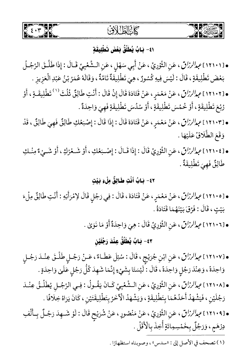 • [١٢١٠٢] عبد الرزاق، عَنْ مَعْمَرٍ، عَنْ قَتَادَةَ قَالَ إِنْ قَالَ: أَنْتِ طَالِقٌ ثُلُثَ (¬١) تَطْلِيقَةٍ، أَوْ رُبُعَ تَطْلِيقَةٍ، أَوْ خُمُسَ تَطْلِيقَةٍ، أَوْ سُدُسَ تَطْلِيقَةٍ فَهِيَ وَاحِدَةٌ.