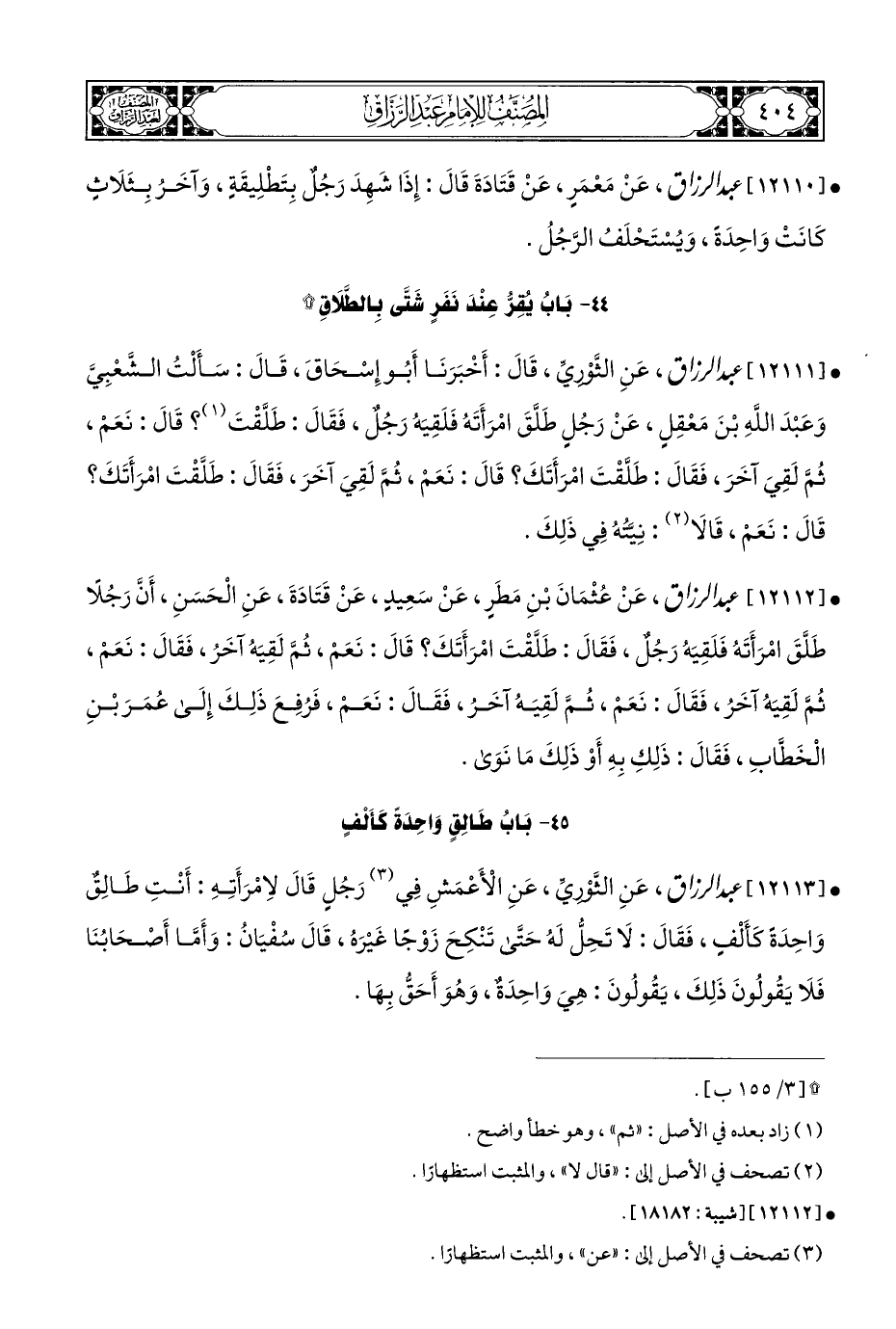 • [١٢١١١] عبد الرزاق، عَنِ الثَّوْرِيِّ، قَالَ: أَخْبَرَنَا أَبُو إِسْحَاقَ، قَالَ: سَأَلْتُ الشَّعْبِيَّ وَعَبْدَ اللَّهِ بْنَ مَعْقِلٍ، عَنْ رَجُلٍ طَلَّقَ امْرَأَتَهُ فَلَقِيَهُ رَجُلٌ، فَقَالَ: طَلَّقْتَ (¬١)؟ قَالَ: نَعَمْ، ثُمَّ لَقِيَ آخَرَ، فَقَالَ: طَلَّقْتَ امْرَأَتَكَ؟ قَالَ: نَعَمْ، ثُمَّ لَقِيَ آخَرَ، فَقَالَ: طَلَّقْتَ امْرَأَتَكَ؟ قَالَ: نَعَمْ، قَالَا (¬٢): نِيَّتُهُ فِي ذَلِكَ.