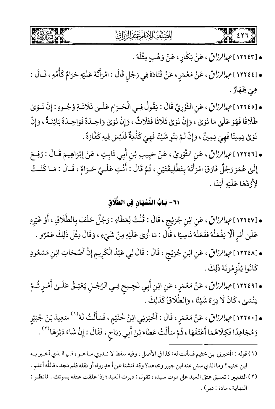 • [١٢٢٤٥] عبد الرزاق، عَنِ الثَّوْرِيِّ قَالَ: يَقُولُ فِي الْحَرَامِ عَلَى ثَلَاثَةِ وُجُوهٍ: إِنْ نَوَى طَلَاقًا فَهُوَ عَلَى مَا نَوَى، وإِنْ نَوَى ثَلَاثًا فَثَلَاثٌ، وإِنْ نَوَى وَاحِدَةً فَوَاحِدَةٌ بَائِنَةٌ، وإِنْ نَوَى يَمِينًا فَهِيَ يَمِينٌ، وإِنْ لَمْ يَنْوِ شَيْئا فَهِيَ كَذْبَة فَلَيْسَ فِيهِ كَفَّارَةٌ.