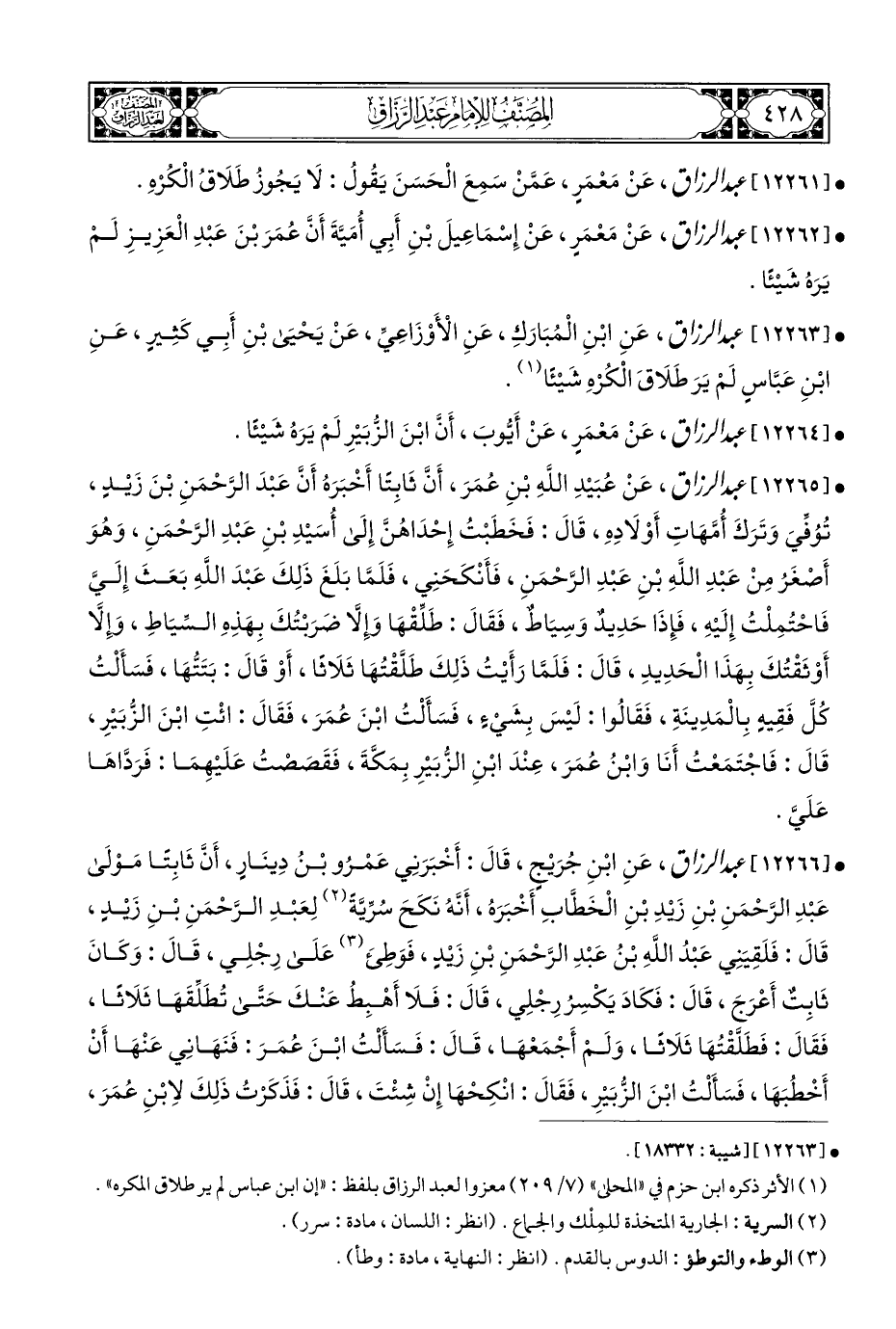 • [١٢٢٦٦] عبد الرزاق، عَنِ ابْنِ جُرَيْجٍ، قَالَ: أَخْبَرَنِي عَمْرُو بْنُ دِينَارٍ، أَنَّ ثَابِتًا مَوْلَى عَبْدِ الرَّحْمَنِ بْنِ زَيْدِ بْنِ الْخَطَّابِ أَخْبَرَهُ، أَنَّهُ نَكَحَ سُرِّيَّةً (¬٢) لِعَبْدِ الرَّحْمَنِ بْنِ زَيْدٍ، قَالَ: فَلَقِيَنِي عَبْدُ اللَّهِ بْنُ عَبْدِ الرَّحْمَنِ بْنِ زَيْدٍ، فَوَطِنَ (¬٣) عَلَى رِجْلِي، قَالَ: وَكَانَ ثَابِتٌ أَعْرَجَ، قَالَ: فَكَادَ يَكْسِرُ رِجْلِي، قَالَ: فَلَا أَهْبِطُ عَنْكَ حَتَّى تُطَلِّقَهَا ثَلَاثًا، فَقَالَ: فَطَلَّقْتُهَا ثَلَاثًا، وَلَمْ أَجْمَعْهَا، قَالَ: فَسَأَلْتُ ابْنَ عُمَرَ: فَنَهَانِي عَنْهَا أَنْ أَخْطُبَهَا، فَسَأَلْتُ ابْنَ الزُّبَيْرِ، فَقَالَ: انْكِحْهَا إِنْ شِئْتَ، قَالَ: فَذَكَرْتُ ذَلِكَ لاِبْنِ عُمَرَ،
