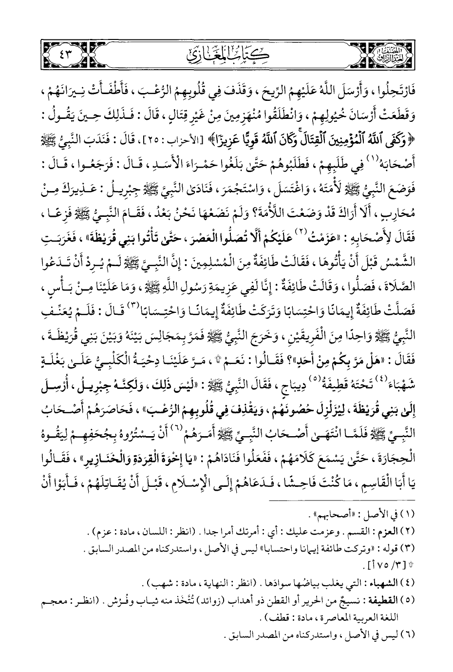 فَارْتَحِلُوا، وَأَرْسَلَ اللهُ عَلَيْهِمُ الرِّيحَ، وَقَذَفَ فِي قُلُوبِهِمُ الرُّعْبَ، فَأَطْفَأَتْ نِيرَانَهُمْ، وَقَطَعَتْ أَرْسَانَ خُيُولِهِمْ، وَانْطَلَقُوا مُنْهَزِمِينَ مِنْ غَيْرِ قِتَالٍ، قَالَ: فَذَلِكَ حِينَ يَقُولُ: {وَكَفَى اللَّهُ الْمُؤْمِنِينَ الْقِتَالَ وَكَانَ اللَّهُ قَوِيًّا عَزِيزًا} [الأحزاب: ٢٥]، قَالَ: فَنَدَبَ النَّبِيُّ - صلى الله عليه وسلم - أَصْحَابَهُ (¬١) فِي طَلَبِهِمْ، فَطَلَبُوهُمْ حَتَّى بَلَغُوا حَمْرَاءَ الْأَسَدِ، قَالَ: فَرَجَعُوا، قَالَ: فَوَضَعَ النَّبِيُّ - صلى الله عليه وسلم - لأْمَتَهُ، وَاغْتَسَلَ، وَاسْتَجْمَرَ، فَنَادَى النَّبِيِّ - صلى الله عليه وسلم - جِبْرِيلُ: عَذِيرَكَ مِنْ مُحَارِبٍ، أَلَا أَرَاكَ قَدْ وَضَعْتَ اللَّأْمَةَ؟ وَلَمْ نَضَعْهَا نَحْنُ بَعْدُ، فَقَامَ النَّبِيُّ - صلى الله عليه وسلم - فَزِعًا، فَقَالَ لِأَصْحَابِهِ: "عَزَمْتُ (¬٢) عَلَيْكُمْ ألا تُصَلُّوا الْعَصْرَ، حَتَّى تَأْتُوا بَنِي قُرَيظَةَ"، فَغَرَبَتِ الشَّمْسُ قَبْلَ أَنْ يَأْتُوهَا، فَقَالَتْ طَائِفَةٌ مِنَ الْمُسْلِمِينَ: إِن النَّبِيَّ - صلى الله عليه وسلم - لَمْ يُرِدْ أَنْ تَدَعُوا الصَّلَاةَ، فَصَلُّوا، وَقَالَتْ طَائِفَةٌ: إِنَّا لَفِي عَزِيمَةِ رَسُولِ اللهِ - صلى الله عليه وسلم -، وَمَا عَلَيْنَا مِنْ بَأْسٍ، فَصَلَّتْ طَائِفَةٌ إِيمَانًا وَاحْتِسَابًا وَتَرَكَتْ طَائِفَةٌ إِيمَانًا وَاحْتِسَابًا (¬٣) قَالَ: فَلَمْ يُعَنِّفِ النَّبِيُّ - صلى الله عليه وسلم - وَاحِدًا مِنَ الْفَرِيقَيْنِ، وَخَرَجَ النَّبِيُّ - صلى الله عليه وسلم - فَمَرَّ بِمَجَالِسَ بَيْنَهُ وَبَيْنَ بَنِي قُرَيْظَةَ، فَقَالَ: "هَلْ مَرَّ بِكُمْ مِنْ أَحَدٍ"؟ فَقَالُوا: نَعَمْ (*)، مَرَّ عَلَيْنَا دِحْيَةُ الْكَلْبِيُّ عَلَى بَغْلَةٍ شَهْبَاءَ (¬٤) تَحْتَهُ قَطِيفَةُ (¬٥) دِيبَاجٍ، فَقَالَ النَّبِيُّ - صلى الله عليه وسلم -: "لَيْسَ ذَلِكَ، وَلَكِنَّهُ جِبْرِيلُ، أُرْسِلَ إِلَى بَنِي قُرَيْظَةَ، لِيُزَلْزِلَ حُصُونَهُمْ، وَيَقذِفَ فِي قُلُوبِهِمُ الرُّعْبَ"، فَحَاصَرَهُمْ أَصحَابُ النَّبِيِّ - صلى الله عليه وسلم - فَلَمَّا انْتَهَى أَصْحَابُ النَّبِيِّ - صلى الله عليه وسلم - أَمَرَهُمْ (¬٦) أَنْ يَسْتُرُوهُ بِجُحَفِهِمْ لِيَقُوهُ الْحِجَارَةَ، حَتَّى يَسْمَعَ كَلَامَهُمْ، فَفَعَلُوا فَنَادَاهُمْ: "يَا إِخوَةَ الْقِرَدَةِ وَالْخَنَازِيرِ"، فَقَالُوا يَا أَبَا الْقَاسِمِ، مَا كنْتَ فَاحِشًا، فَدَعَاهُمْ إِلَى الْإِسْلَامِ، قَبْلَ أَنْ يُقَاتِلَهُمْ، فَأَبَوْا أَنْ