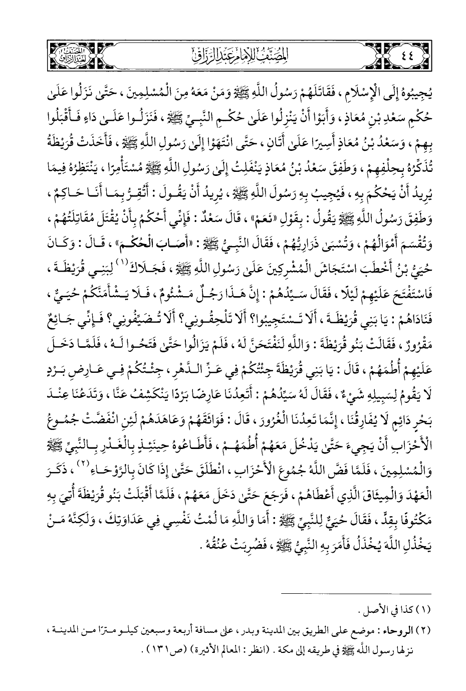 يُجِيبُوهُ إِلَى الْإِسْلَامِ، فَقَاتَلَهُمْ رَسُولُ اللهِ - صلى الله عليه وسلم - وَمَنْ مَعَهُ مِنَ الْمُسْلِمِينَ، حَتَّى نَزَلُوا عَلَى حُكْمِ سَعْدِ بْنِ مُعَاذٍ، وَأَبَوْا أَنْ يَنْزِلُوا عَلَى حُكْمِ النَّبِيِّ - صلى الله عليه وسلم -، فَنَزَلُوا عَلَى دَاءٍ فَأَقْبَلُوا بِهِمْ، وَسَعْدُ بْنُ مُعَاذٍ أَسِيرًا عَلَى أَتَانٍ، حَتَّى انْتَهَوْا إِلَى رَسُولِ اللهِ - صلى الله عليه وسلم -، فَأَخَذَتْ قُرَيظَةُ تُذَكِّرُهُ بِحِلْفِهِمْ، وَطَفِقَ سَعْدُ بْنُ مُعَاذٍ يَنْفَلِتُ إِلَى رَسُولِ اللهِ - صلى الله عليه وسلم - مسْتَأْمِرًا، يَنْتَظِرُهُ فِيمَا يُرِيدُ أَنْ يَحْكُمَ بِهِ، فَيُجِيبُ بِهِ رَسُولَ اللهِ - صلى الله عليه وسلم -، يُرِيدُ أَنْ يَقُولَ: أَتُقِرُّ بِمَا أَنَا حَاكِمٌ، وَطَفِقَ رَسُولُ اللهِ - صلى الله عليه وسلم - يَقُولُ: بِقَوْلِ "نَعَمْ"، قَالَ سَعْدٌ: فَإِنِّي أَحْكُمُ بِأَنْ يُقْتَلَ مُقَاتِلَتُهُمْ، وَتُقْسَمَ أَمْوَالُهُمْ، وَتُسْبَى ذَرَارِيُّهُمْ، فَقَالَ النَّبِيُّ - صلى الله عليه وسلم -: "أَصَابَ الْحُكْمَ"، قَالَ: وَكَانَ حُيَيُّ بْنُ أَخْطَبَ اسْتَجَاشَ الْمُشْرِكِينَ عَلَى رَسُولِ اللهِ - صلى الله عليه وسلم -، فَجَلَاكَ (¬١) لِبَنِي قُرَيْظَةَ، فَاسْتَفْتَحَ عَلَيْهِمْ لَيْلًا، فَقَالَ سَيِّدُهُمْ: إِنَّ هَذَا رَجُلٌ مَشْئُومٌ، فَلَا يَشْأَمَنَّكُمْ حُيَيٌّ، فَنَادَاهُمْ: يَا بَنِي قُرَيْظَةَ، أَلَا تَسْتَجِيبُوا؟ أَلَا تَلْحِقُونِي؟ أَلَا تُضَيِّفُونِي؟ فَإِنِّي جَائِعٌ مَقْرُورٌ، فَقَالَتْ بَنُو قُرَيْظَةَ: وَاللهِ لَنَفْتَحَنَّ لَهُ، فَلَمْ يَزَالُوا حَتَّى فَتَحُوا لَهُ، فَلَمَّا دَخَلَ عَلَيْهِمْ أُطُمَهُمْ، قَالَ: يَا بَنِي قُرَيْظَةَ جِئْتُكُمْ فِي عَزِّ الدَّهْرِ، جِئْتُكُمْ فِي عَارِضِ بَرْدٍ لَا يَقُومُ لِسَبِيلِهِ شَيْءٌ، فَقَالَ لَهُ سَيِّدُهُمْ: أَتَعِدُنَا عَارِضًا بَرْدًا يَنْكَشِفُ عَنَّا، وَتَدَعُنَا عِنْدَ بَحْرٍ دَائِمٍ لَا يُفَارِقُنَا، إِنَّمَا تَعِدُنَا الْغُرُورَ، قَالَ: فَوَاثَقَهُمْ وَعَاهَدَهُمْ لَئِنِ انْفَضَّتْ جُمُوعُ الْأَحْزَابِ أَنْ يَجِيءَ حَتَّى يَدْخُلَ مَعَهُمْ أُطُمَهُمْ، فَأَطَاعُوهُ حِينَئِذٍ بِالْغَدْرِ بِالنَّبِيِّ - صلى الله عليه وسلم - وَالْمُسْلِمِينَ، فَلَمَّا فَضَّ اللهُ جُمُوعَ الْأَحْزَابِ، انْطَلَقَ حَتَّى إِذَا كَانَ بِالرَّوْحَاءِ (¬٢)، ذَكَرَ الْعَهْدَ وَالْمِيثَاقَ الَّذِي أَعْطَاهُمْ، فَرَجَعَ حَتَّى دَخَلَ مَعَهُمْ، فَلَمَّا أَقْبَلَتْ بَنُو قُرَيْظَةَ أُتِيَ بِهِ مَكْتُوفًا بِقِدٍّ، فَقَالَ حُيَيٌّ لِلنَّبِيِّ - صلى الله عليه وسلم -: أَمَا وَاللهِ مَا لُمْتُ نَفْسِي فِي عَدَاوَتِكَ، وَلَكِنَّهُ مَنْ يَخْذُلِ اللهَ يُخْذَلُ فَأَمَرَ بِهِ النَّبِيُّ - صلى الله عليه وسلم -، فَضُرِبَتْ عُنُقُهُ.