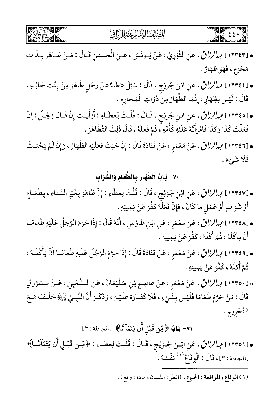 ° [١٢٣٥٠] عبد الرزاق، عَنْ مَعْمَرٍ، عَنْ عَاصِمِ بْنِ سُلَيْمَانَ، عَنِ الشَّعْبِيِّ، عَنْ مَسْرُوقٍ قَالَ: مَنْ حَرَّمَ طَعَامًا فَلَيْسَ بِشَيءٍ، فَلَا كَفَّارَةَ عَلَيْهِ، وَذَكَرَ أَنَّ النَّبِيَّ - صلى الله عليه وسلم - حَلَفَ مَعَ التَّحْرِيمِ.