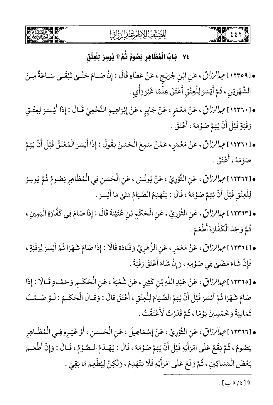 • [١٢٣٦٥] عبد الرزاق، عَنْ عَبْدِ اللَّهِ بْنِ كَثِيرٍ، عَنْ شُعْبَةَ، عَنِ الْحَكَمِ وَحَمَّادٍ قَالَا: إِذَا صامَ شَهْرًا ثُمَّ أَيْسَرَ قَبْلَ أَنْ يُتِمَّ الصِّيَامَ لِلْعِتْقِ، أَعْتَقَ قَالَ: وَقَالَ الْحَكَمُ: لَوْ صُمْتُ ثَمَانِيَةً وَخَمْسِينَ يَوْمًا، ثُمَّ قَدَرْتُ لأَعْتَقْتُ.