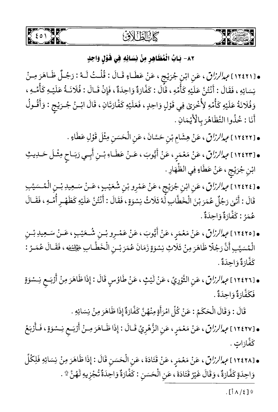 • [١٢٤٢٧] عبد الرزاق، عَنْ مَعْمَرٍ، عَنِ الزُّهْرِيِّ قَالَ: إِذَا ظَاهَرَ مِنْ أَرْبَعِ نِسْوَةٍ، فَأَرْبَعُ كَفَّارَاتٍ.