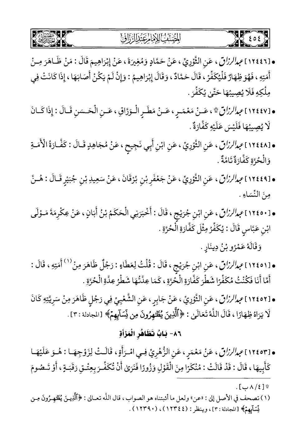 (¬١) تصحف في الأصل إلى: "عن" ولعل ما أثبتناه هو الصواب، قال الله تعالى: {وَالَّذِينَ يُظَاهِرُونَ مِنْ نِسَائِهِمْ} [المجادلة: ٣]، وينظر: (١٢٣٤٤)، (١٢٣٩٠).