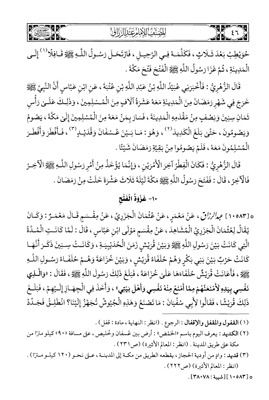 (¬٢) الكديد: يعرف اليوم باسم "الحَمْض": أرض بين عُسفان وخُليص، على مسافة "٩٠" كيلو مترًا من مكة على طريق المدينة. (انظر: المعالم الأثيرة) (ص ٢٣١).
