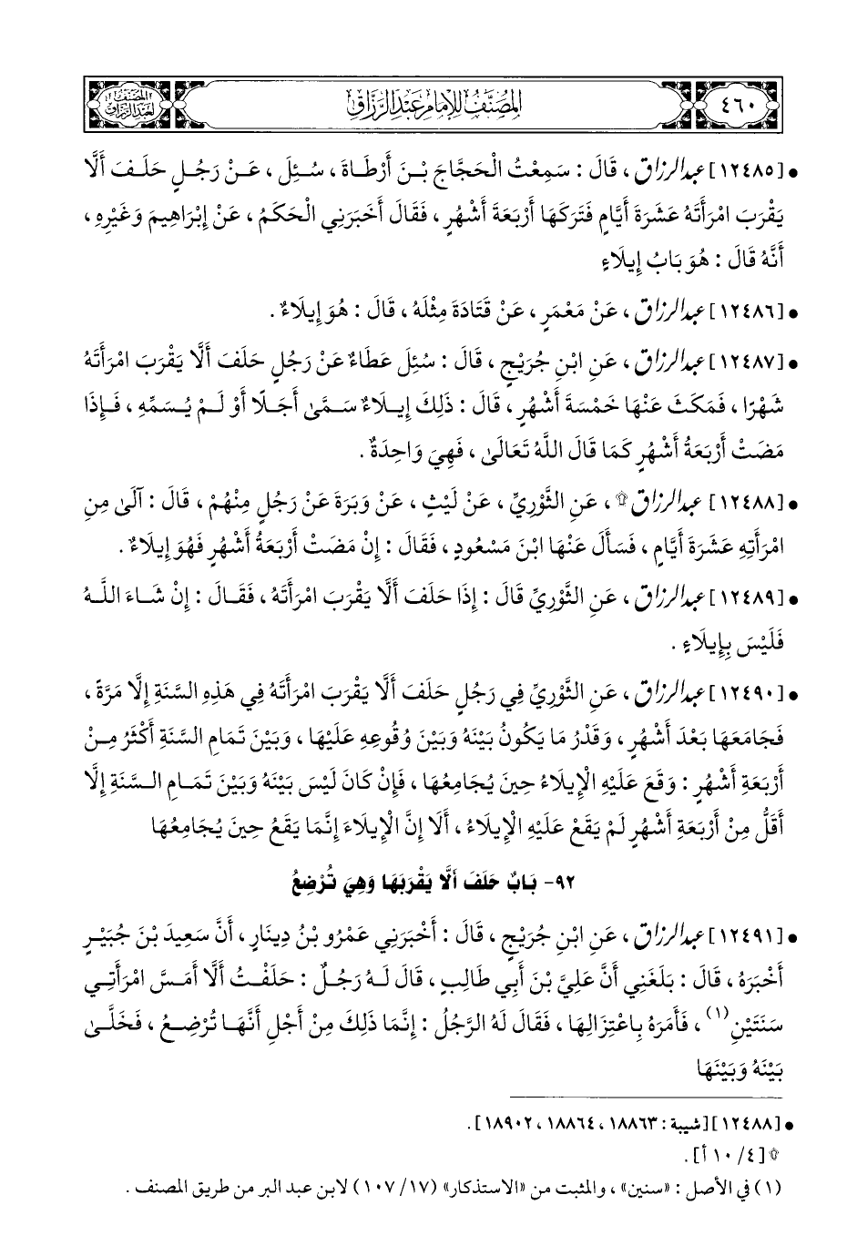 • [١٢٤٩٠] عبد الرزاق، عَنِ الثَّوْرِيِّ فِي رَجُلٍ حَلَفَ أَلَّا يَقْرَبَ امْرَأَتَهُ فِي هَذِهِ السَّنَةِ إِلَّا مَرَّة، فَجَامَعَهَا بَعْدَ أَشْهُرٍ، وَقَدْرُ مَا يَكُونُ بَيْنَهُ وَبَيْنَ وُقُوعِهِ عَلَيهَا، وَبَيْنَ تَمَامِ السَّنَةِ أَكْثَرُ مِنْ أَرْبَعَةِ أَشْهُرٍ: وَقَعَ عَلَيْهِ الْإِيلَاءُ حِينَ يُجَامِعُهَا، فَإِنْ كَانَ لَيْسَ بَيْنَهُ وَبَيْنَ تَمَامِ السَّنَةِ إِلَّا أَقَلُّ مِنْ أَرْبَعَةِ أَشْهُرٍ لَمْ يَقَعْ عَلَيْهِ الْإِيلَاءُ، أَلَا إِنَّ الْإِيلَاءَ إِنَّمَا يَقَعُ حِينَ يُجَامِعُهَا.