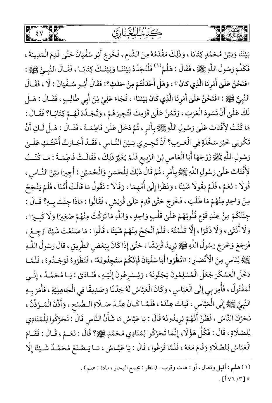 بَيْنَنَا وَبَيْنَ مُحَمَّدٍ كِتَابًا، وَذَلِكَ مَقْدَمُهُ مِنَ الشَّامِ، فَخَرَجَ أَبُو سُفْيَانَ حَتَّى قَدِمَ الْمَدِينَةَ، فَكَلَّمَ رَسُولَ اللهِ - صلى الله عليه وسلم -، فَقَالَ: هَلُمَّ (¬١) فَلْنُجدِّدْ بَيْنَنَا وَبَيْنَكَ كِتَابَا، فَقَالَ النَّبِيُّ - صلى الله عليه وسلم -: "فَنَحْنُ عَلَى أَمْرِنَا الَّذِي كَانَ (*)، وَهَلْ أَحْدَثْتُمْ مِنْ حَدَثٍ؟ " فَقَالَ أَبُو سُفْيَانَ: لَا، فَقَالَ النَّبِيُّ - صلى الله عليه وسلم -: "فَنَحْنُ عَلَى أَمْرِنَا الَّذِي كَانَ بَيْنَنَا"، فَجَاءَ عَلِيَّ بْنَ أَبِي طَالِبٍ، فَقَالَ: هَلْ لَكَ عَلَى أَنْ تَسُودَ الْعَرَبَ، وَتَمُنَّ عَلَى قَوْمِكَ فَتُجِيرَهُمْ، وَتُجَدِّدَ لَهُمْ كِتَابًا؟ فَقَالَ: مَا كُنْتُ لِأَفْتَاتَ عَلَى رَسُولِ اللهِ - صلى الله عليه وسلم - بِأَمْرٍ، ثُمَّ دَخَلَ عَلَى فَاطِمَةَ، فَقَالَ: هَلْ لَكِ أَنْ تَكُونِي خَيْرَ سَخْلَةٍ فِي الْعَرَبِ؟ أَنْ تُجِيرِي بَيْنَ النَّاسِ، فَقَدْ أَجَارَتْ أُخْتُكِ عَلَى رَسُولِ اللهِ - صلى الله عليه وسلم - زَوْجَهَا أَبَا الْعَاصِ بْنَ الرَّبِيعِ فَلَمْ يُغَيِّرْ ذَلِكَ، فَقَالَتْ فَاطِمَةُ: مَا كُنْتُ لِأَفْتَاتَ عَلَى رَسُولِ اللهِ - صلى الله عليه وسلم - بِأَمْرٍ، ثُمَّ قَالَ ذَلِكَ لِلْحَسَنِ وَالْحُسَيْنِ: أَجِيرَا بَيْنَ النَّاسِ، قُولَا: نَعَمْ، فَلَمْ يَقُولَا شَيْئًا، وَنَظَرَا إِلَى أُمِّهِمَا، وَقَالَا: نَقُولُ مَا قَالَتْ أُمُّنَا، فَلَمْ يَنْجَحْ مِنْ وَاحِدٍ مِنْهُمْ مَا طَلَبَ، فَخَرَجَ حَتَّى قَدِمَ عَلَى قُرَيْشٍ، فَقَالُوا: مَاذَا جِئْتَ بِهِ؟ قَالَ: جِئْتُكُمْ مِنْ عِنْدِ قَوْمٍ قُلُوبُهُمْ عَلَى قَلْبٍ وَاحِدٍ، وَاللهِ مَا تَرَكْتُ مِنْهُمْ صَغِيرًا وَلَا كَبِيرًا، وَلَا أُنْثَى، وَلَا ذَكَرًا، إِلَّا كَلَّمْتُهُ، فَلَمْ أَنْجَحْ مِنْهُمْ شَيْئًا، قَالُوا: مَا صَنَعْتَ شَيْئًا ارْجِعْ، فَرَجَعَ وَخَرَجَ رَسُولُ اللهِ - صلى الله عليه وسلم - يُرِيدُ قُرَيْشًا، حَتَّى إِذَا كَانَ بِبَعْضِ الطَّرِيقِ، قَالَ رَسُولُ اللهِ - صلى الله عليه وسلم - لِنَاسٍ مِنَ الْأَنْصارِ: "انْظُرُوا أَبَا سُفْيَانَ فَإِنَّكُمْ سَتَجِدُونَهُ"، فَنَظَرُوهُ فَوَجَدُوهُ، فَلَمَّا دَخَلَ الْعَسْكَرَ جَعَلَ الْمُسْلِمُونَ يَجَئُونَهُ، وَيُسْرِعُونَ إِلَيْهِ، فَنَادَى: يَا مُحَمَّدُ، إِنِّي لَمَقْتُولٌ، فَأُمِرَ بِي إِلَى الْعَبَّاسٍ، وَكَانَ الْعَبَّاسُ لَهُ خِدْنًا وَصدِيقًا فِي الْجَاهِلِيَّةِ، فَأَمَرَ بِهِ النَّبِيُّ - صلى الله عليه وسلم - إلَى الْعَبَّاسٍ، فَبَاتَ عِنْدَهُ، فَلَمَّا كَانَ عِنْدَ صَلَاةِ الصُّبْحِ، وَأَذَّنَ الْمُؤَذِّنُ، تَحَرَّكَ النَّاسُ، فَظَنَّ أَنَّهُمْ يُرِيدُونَهُ قَالَ: يَا عَبَّاسُ مَا شَأْنُ النَّاسِ قَالَ: تَحَرَّكُوا لِلْمُنَادِي لِلصَّلَاةِ، قَالَ: فَكُلُّ هَؤُلَاءِ إِنَّمَا تَحَرَّكُوا لِمُنَادِي مُحَمَّدٍ - صلى الله عليه وسلم -؟ قَالَ: نَعَمْ، قَالَ: فَقَامَ الْعَبَّاسُ لِلصَّلَاةِ وَقَامَ مَعَهُ، فَلَمَّا فَرَغُوا، قَالَ: يَا عَبَّاسُ، مَا يَصْنَعُ مُحَمَّدٌ شَيْئًا إِلَّا