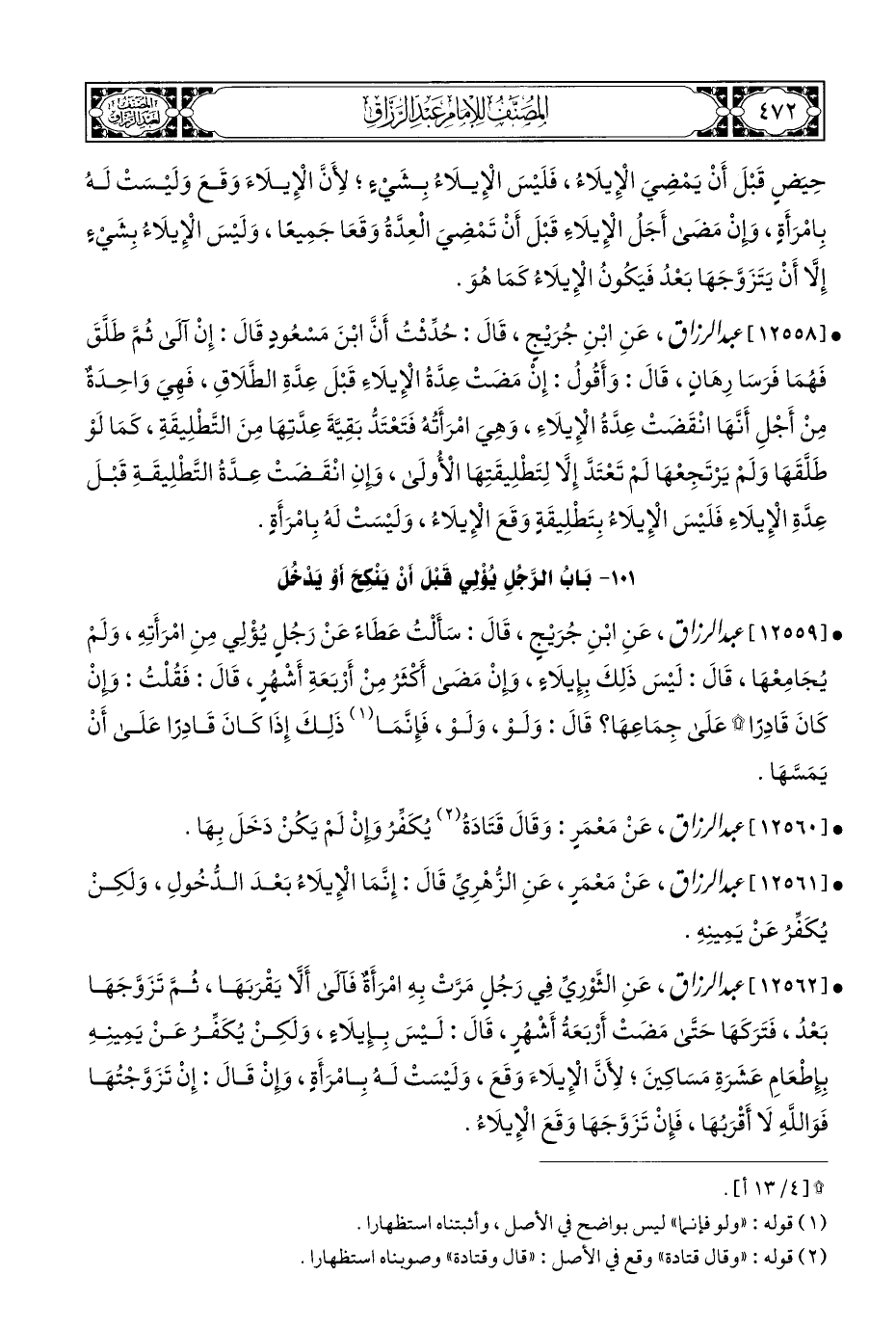 • [١٢٥٥٨] عبد الرزاق، عَنِ ابْنِ جُرَيْجٍ، قَالَ: حُدِّثْتُ أَن ابْنَ مَسْعُودٍ قَالَ: إِنْ آلى ثُمَّ طَلَّقَ فَهُمَا فَرَسَا رِهَانٍ، قَالَ: وَأَقُولُ: إِنْ مَضَتْ عِدَّةُ الْإِيلَاءِ قَبْلَ عِدَّةِ الطَّلَاقِ، فَهِيَ وَاحِدَةٌ مِنْ أَجْلِ أَنَّهَا انْقَضَتْ عِدَّةُ الْإِيلَاءِ، وَهِيَ امْرَأَتُهُ فَتَعْتَدُّ بَقِيَّةَ عِدَّتِهَا مِنَ التَّطْلِيقَةِ، كَمَا لَوْ طَلَّقَهَا وَلَمْ يَرْتَجِعْهَا لَمْ تَعْتَدَّ إِلَّا لِتَطْلِيقَتِهَا الْأُولَى، وإن انْقَضَتْ عِدَّةُ التَّطْلِيقَةِ قَبْلَ عِدَّةِ الْإِيلَاءِ فَلَيْسَ الْإِيلَاءُ بِتَطْلِيقَةٍ وَقَعَ الْإِيلَاءُ، وَلَيْسَتْ لَهُ بِامْرَأَةٍ.