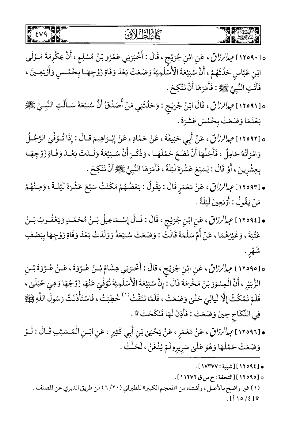 ° [١٢٥٩٠] عبد الرزاق، عَنِ ابْنِ جُرَيْجٍ، قَالَ: أَخْبَرَنِي عَمْرُو بْنُ مُسْلِمٍ، أَنَّ عِكْرِمَةَ مَوْلَى ابْنِ عَبَّاسٍ حَدَّثَهُمْ، أَنَّ سُبَيْعَةَ الْأَسْلَمِيَّةَ وَضَعَتْ بَعْدَ وَفَاةِ زَوْجِهَا بِخَمْسٍ وَأَرْبَعِينَ، فَأَتَتِ النَّبِي - صلى الله عليه وسلم -: فَأَمَرَهَا أَنْ تَنْكِحَ.