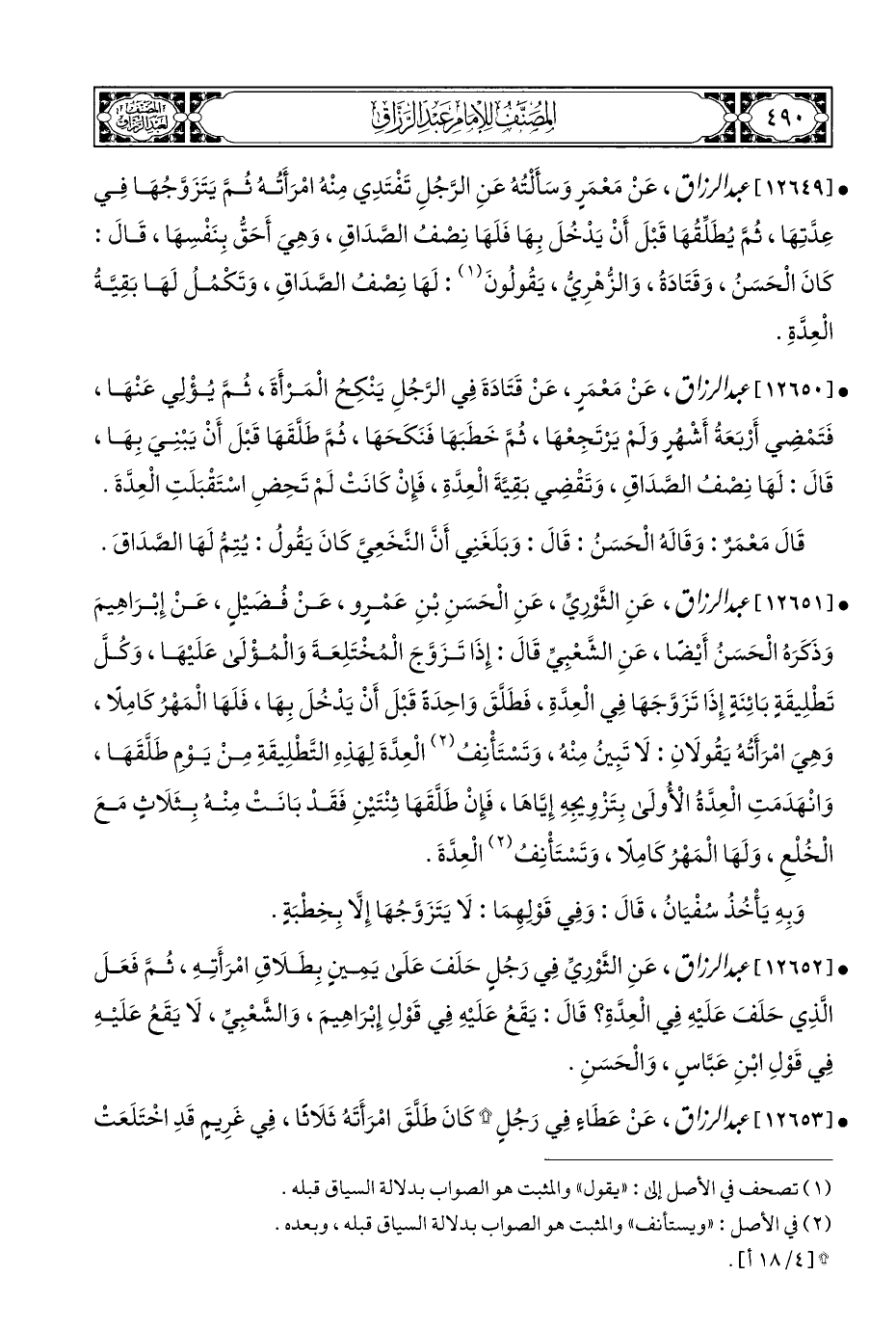 • [١٢٦٤٩] عبد الرزاق، عَنْ مَعْمَرٍ وَسَأَلْتُهُ عَنِ الرَّجُلِ تَفْتَدِي مِنْهُ امْرَأَتُهُ ثُمَّ يَتَزَوَّجُهَا فِي عِدَّتِهَا، ثُمَّ يُطَلِّقُهَا قَبْلَ أَنْ يَدْخُلَ بِهَا فَلَهَا نِصْفُ الصَّدَاقِ، وَهِيَ أَحَقُّ بِنَفْسِهَا، قَالَ: كَانَ الْحَسَنُ، وَقَتَادَةُ، وَالزُّهْرِيُّ، يَقُولُونَ (¬١): لَهَا نِصْفُ الصَّدَاقِ، وَتَكْمُلُ لَهَا بَقِيَّةُ الْعِدَّةِ.