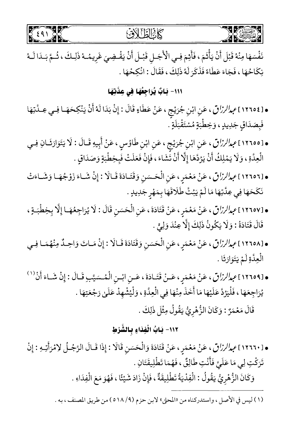 • [١٢٦٥٩] عبد الرزاق، عَنْ مَعْمَرٍ، عَنْ قَتَادَةَ، عَنِ ابْنِ الْمُسَيَّبِ قَالَ: إِنْ شَاءَ أَنْ (¬١) يُرَاجِعَهَا، فَلْيَرُدَّ عَلَيْهَا مَا أَخَذَ مِنْهَا فِي الْعِدَّةِ، وَلْيُشْهِدْ على رَجْعَتِهَا.