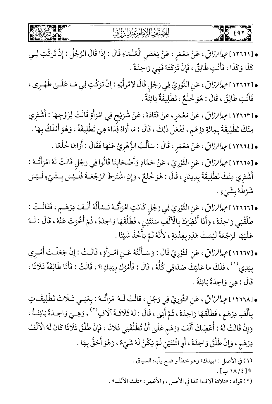• [١٢٦٦٨] عبد الرزاق، عَنِ الثَّوْريِّ فِي رَجُلٍ، قَالَتْ لَهُ امْرَأَتُهُ: بِعْنِي ثَلَاثَ تَطْلِيقَاتٍ بِأَلْفِ دِرْهَمٍ، فَطَلَّقَهَا وَاحِدَةً، ثُمَّ أَبَى، قَالَ: لَهُ ثَلَاثَةُ آلَافٍ (¬٢)، وَهِيَ وَاحِدَةٌ بَائِنَةٌ، وإن قَالَتْ لَهُ: أُعْطِيكَ أَلْفَ دِرْهَمٍ على أَنْ تُطَلِّقَنِي ثَلَاثًا، فَإِنْ طَلَّقَ ثَلَاثًا كَانَ لَهُ الْألفُ دِرْهَمٍ، وإن طَلَّقَ وَاحِدَةً، أَوِ اثْنَتَيْنِ لَمْ يَكُنْ لَهُ شَيءٌ، وَهُوَ أَحَقُّ بِهَا.
