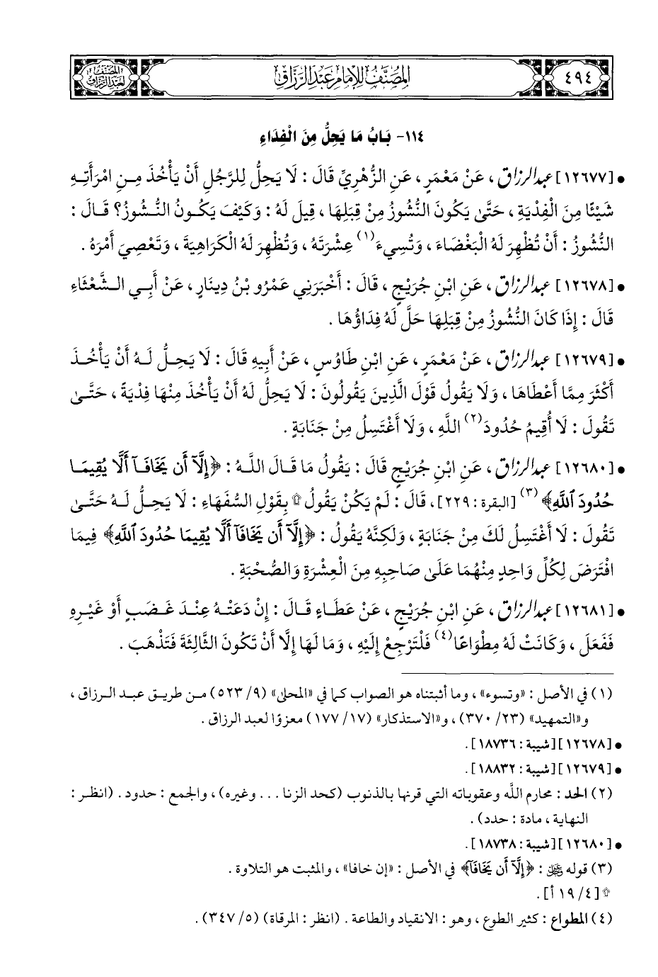 • [١٢٦٨٠] عبد الرزاق، عَنِ ابْنِ جُرَيْجٍ قَالَ: يَقُولُ مَا قَالَ اللَّهُ: {إِلَّا أَنْ يَخَافَا أَلَّا يُقِيمَا حُدُودَ اللَّهِ} [البقرة: ٢٢٩] (¬٣) , قَالَ: لَمْ يَكُنْ يَقُولُ * بِقَوْلِ السُّفَهَاءِ: لَا يَحِلُّ لَهُ حَتَّى تَقُولَ: لَا أَغْتَسِلُ لَكَ مِنْ جَنَابةٍ، وَلكنَّهُ يَقُولُ: {إِلَّا أَنْ يَخَافَا أَلَّا يُقِيمَا حُدُودَ اللَّهِ} فِيمَا افْتَرَضَ لِكُلِّ وَاحِدٍ مِنْهُمَا على صَاحِبِهِ مِنَ الْعِشْرَةِ وَالصُّحْبَةِ.