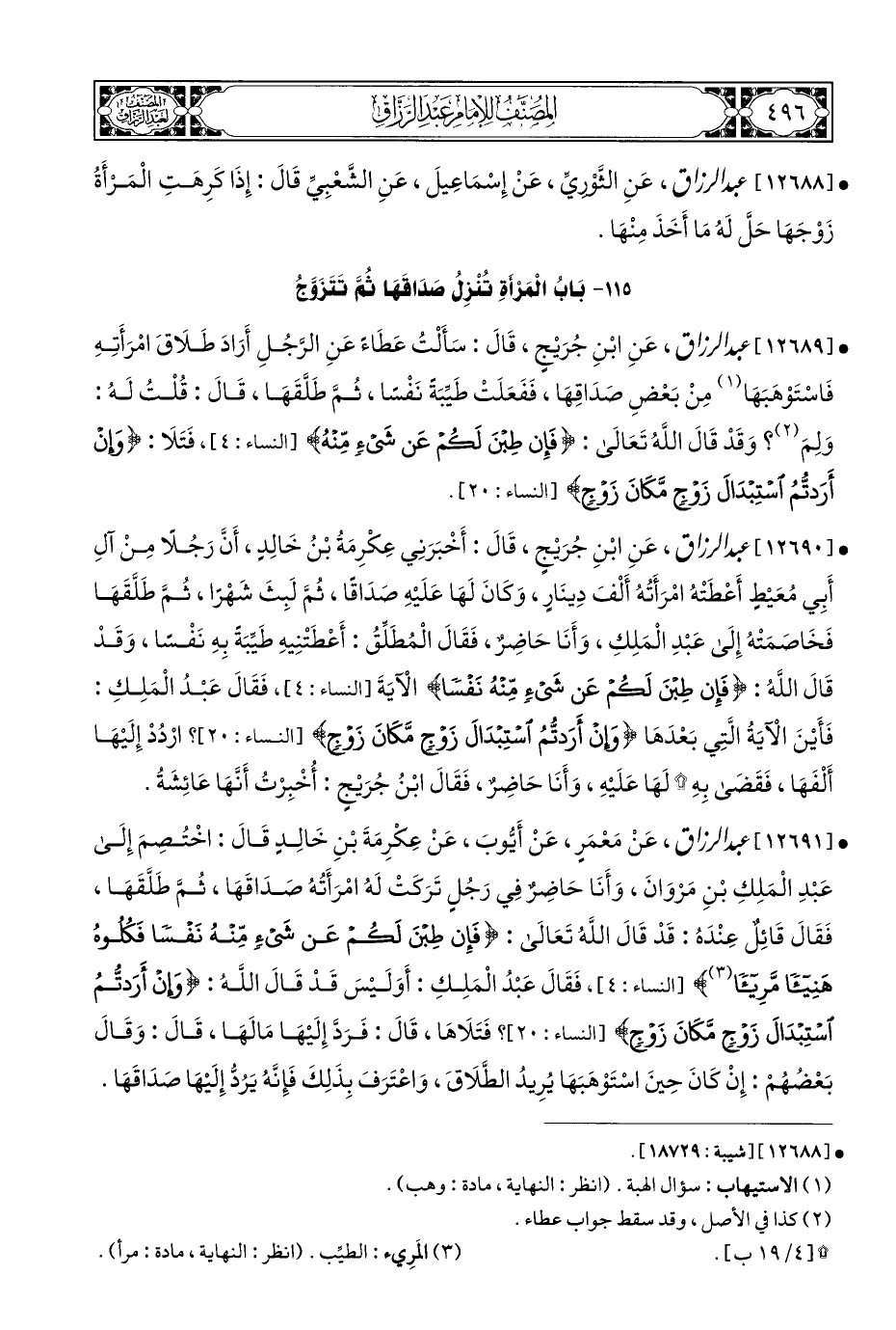 • [١٢٦٨٩] عبد الرزاق، عَنِ ابْنِ جُرَيْجٍ، قَالَ: سَأَلْتُ عَطَاءً عَنِ الرَّجُلِ أَرَادَ طَلَاقَ امْرَأَتِهِ فَاسْتَوْهَبَهَا (¬١) مِنْ بَعْضِ صَدَاقِهَا، فَفَعَلَتْ طَيِّبَةَ نَفْسًا، ثُمَّ طَلَّقَهَا، قَالَ: قُلْتُ لَهُ: وَلِمَ (¬٢)؟ وَقَدْ قَالَ اللَّهُ تَعَالَى: {فَإِنْ طِبْنَ لَكُمْ عَنْ شَيْءٍ مِنْهُ} [النساء: ٤]، فَتَلَا: {وَإِنْ أَرَدْتُمُ اسْتِبْدَالَ زَوْجٍ مَكَانَ زَوْجٍ} [النساء: ٢٠].