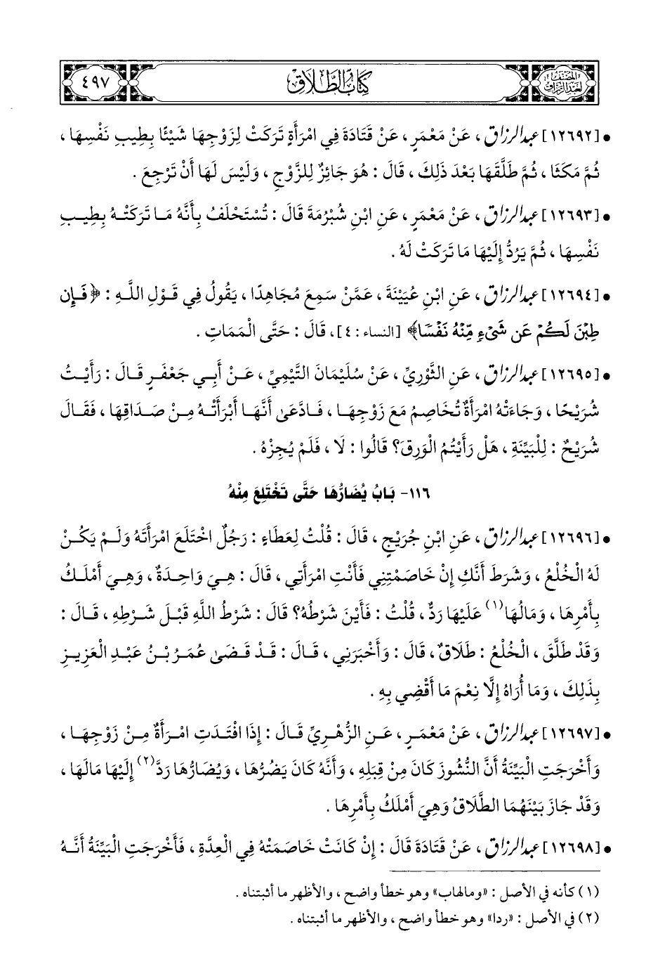 • [١٢٦٩٧] عبد الرزاق، عَنْ مَعْمَر، عَنِ الزُّهْرِيِّ قَالَ: إِذَا افْتَدَتِ امْرَأَةٌ مِنْ زَوْجِهَا، وَأَخْرَجَتِ الْبَيِّنَةُ أَنَّ النُّشُوزَ كَانَ مِنْ قِبَلِهِ، وَأَنَّهُ كَانَ يَضُرُّهَا، وَيُضَارُّهَا رَدَّ (¬٢) إِلَيْهَا مَالَهَا، وَقَدْ جَازَ بَيْنَهُمَا الطَّلَاقُ وَهِيَ أَمْلَكُ بِأَمْرِهَا.