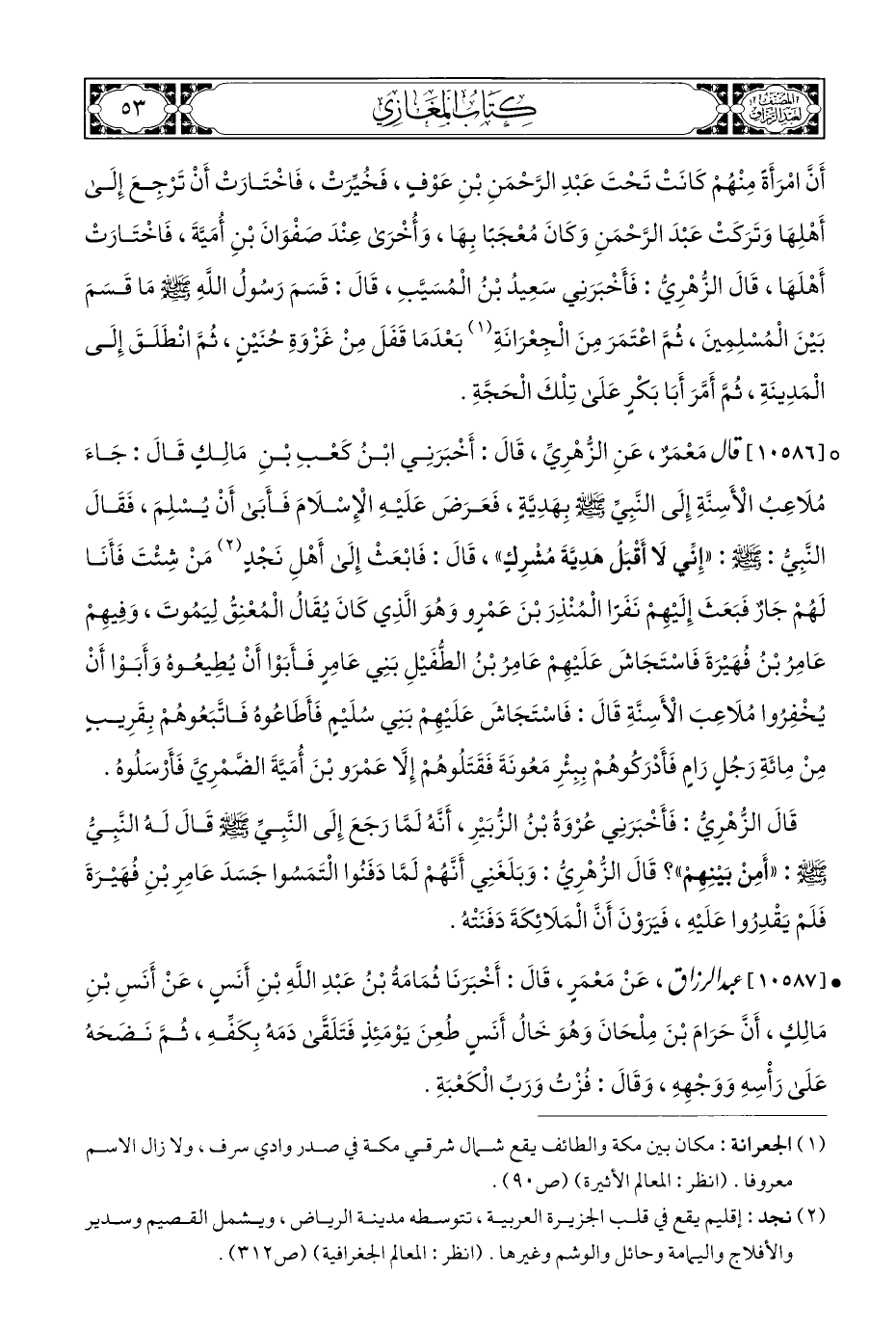 أَنَّ امْرَأَةً مِنْهُمْ كَانَتْ تَحْتَ عَبْدِ الرَّحْمَنِ بْنِ عَوْفٍ، فَخُيِّرَتْ، فَاخْتَارَت أَنْ تَرْجِعَ إِلَى أَهْلِهَا وَتَرَكَتْ عَبْدَ الرَّحْمَنِ وَكَانَ مُعْجَبًا بِهَا، وَأُخْرَى عِنْدَ صَفْوَانَ بْنِ أُمَيَّةَ، فَاخْتَارَتْ أَهْلَهَا، قَالَ الزُّهْرِيُّ: فَأَخْبَرَنِي سَعِيدُ بْنُ الْمُسَيَّبِ، قَالَ: قَسَمَ رَسُولُ اللهِ - صلى الله عليه وسلم - مَا قَسَمَ بَيْنَ الْمُسْلِمِينَ، ثُمَّ اعْتَمَرَ مِنَ الْجِعْرَانَةِ (¬١) بَعْدَمَا قَفَلَ مِنْ غَزْوَةِ حُنَيْنٍ، ثُمَّ انْطَلَقَ إِلَى الْمَدِينَةِ، ثُمَّ أَمَّرَ أَبَا بَكْرٍ عَلَى تِلْكَ الْحَجَّةِ.