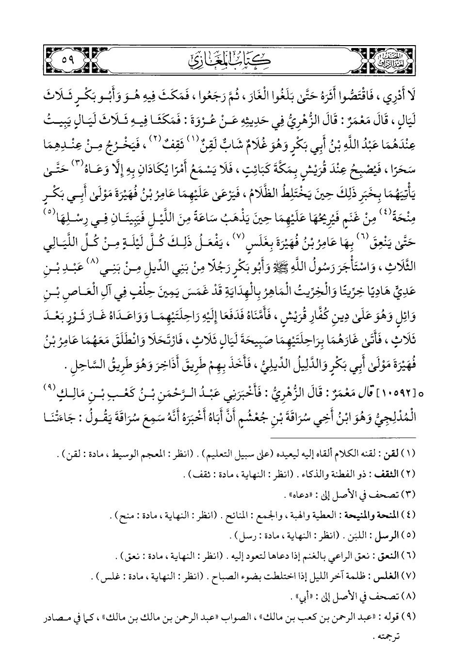 لَا أَدْرِي، فَاقْتَصُّوا أَثَرَهُ حَتَّى بَلَغُوا الْغَارَ، ثُمَّ رَجَعُوا، فَمَكَثَ فِيهِ هُوَ وَأَبُو بَكْرٍ ثَلَاثَ لَيَالٍ، قَالَ مَعْمَرٌ: قَالَ الزُّهْرِيُّ فِي حَدِيثِهِ عَنْ عُرْوَةَ: فَمَكَثَا فِيهِ ثَلَاثَ لَيَالٍ يَبِيتُ عِنْدَهُمَا عَبْدُ اللهِ بْنُ أَبِي بَكْرٍ وَهُوَ غُلَامٌ شَابٌّ لَقِنٌ (¬١) ثَقِفٌ (¬٢)، فَيَخْرُجُ مِنْ عِنْدِهِمَا سَحَرًا، فَيصْبحُ عِنْدَ قُرَيْشٍ بِمَكَّةَ كَبَائِتٍ، فَلَا يَسْمَعُ أَمْرًا يُكَادَانِ بِهِ إِلَّا وَعَاهُ (¬٣) حَتَّى يَأْتِيَهُمَا بِخَبَرِ ذَلِكَ حِينَ يَخْتَلِطُ الظَّلَامُ، فَيَرْعَى عَلَيْهِمَا عَامِرُ بْنُ فُهَيْرَةَ مَوْلَى أَبِي بَكْرٍ مِنْحَةً (¬٤) مِنْ غَنَمٍ فَيُرِيحُهَا عَلَيهِمَا حِينَ يَدْهَبُ سَاعَةً مِنَ اللَّيلِ فَيَبِيتَانِ فِي رِسْلِهَا (¬٥) حَتَّى يَنْعِقَ (¬٦) بِهَا عَامِرُ بْنُ فُهَيْرَةَ بِغَلَسٍ (¬٧)، يَفْعَلُ ذَلِكَ كُلَّ لَيْلَةٍ مِنْ كُلِّ اللَّيَالِي الثَّلَاثِ، وَاسْتَأْجَرَ رَسُولُ اللهِ - صلى الله عليه وسلم - وَأَبُو بَكْرٍ رَجُلًا مِنْ بَنِي الدِّيلِ مِنْ بَنِي (¬٨) عَبْدِ بْنِ عَدِيٍّ هَادِيًا خِرِّيتًا وَالْخِرِّيتُ الْمَاهِرُ بِالْهِدَايَةِ قَدْ غَمَسَ يَمِينَ حِلْفٍ فِي آلِ الْعَاصِ بْنِ وَائِلٍ وَهُوَ عَلَى دِينِ كُفَّارِ قُرَيْشٍ، فَأَمَّنَاهُ فَدَفَعَا إِلَيْهِ رَاحِلَتَيْهِمَا وَوَاعَدَاهُ غَارَ ثَوْرٍ بَعْدَ ثَلَاثٍ، فَأَتَى غَارَهُمَا بِرَاحِلَتَيْهِمَا صَبِيحَةَ لَيَالٍ ثَلَاثٍ، فَارْتَحَلَا وَانْطَلَقَ مَعَهُمَا عَامِرُ بْنُ فُهَيْرَةَ مَوْلى أَبِي بَكْرٍ وَالدَّلِيلُ الدِّيلِيُّ، فَأَخَذَ بِهِمْ طَرِيقَ أَذَاخِرَ وَهُوَ طَرِيقُ السَّاحِلِ.