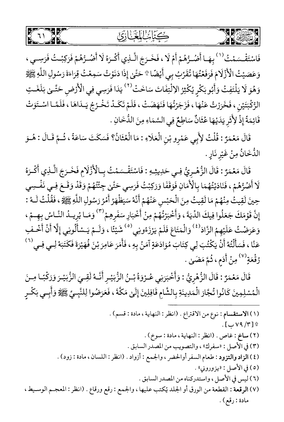 قَالَ مَعْمَرٌ: قَالَ الزُّهْرِيُّ فِي حَدِيثِهِ: فَاسْتَقْسَمْتُ بِالْأَزْلَامِ فَخَرَجَ الَّذِي أَكْرَهُ لَا أَضُرُّهُمْ، فَنَادَيْتُهُمَا بِالْأَمَانِ فَوَقَفَا وَرَكِبْتُ فَرَسِي حَتَّى جِئْتُهُمْ وَقَدْ وَقَعَ فِي نَفْسِي حِينَ لَقِيتُ مِنْهُمْ مَا لَقِيتُ مِنَ الْحَبْسِ عَنْهُمْ أَنَّهُ سَيظْهَرُ أَمْرُ رَسُولِ اللهِ - صلى الله عليه وسلم -، فَقُلْتُ لَهُ: إِنَّ قَوْمَكَ جَعَلُوا فِيكَ الدِّيَةَ، وَأَخْبَرْتُهُمْ مِنْ أَخْبَارِ سَفَرِهِمْ (¬٣) وَمَا يُرِيدُ النَّاسُ بِهِمْ، وَعَرَضتُ عَلَيْهِمُ الزَّادَ (¬٤) وَالْمَتَاعَ فَلَمْ يَرْزَءُونِي (¬٥) شَيْئًا، وَلَمْ يَسْأَلُونِي إِلَّا أَنْ أَخْفِ عَنَّا، فَسَأَلْتُهُ أَنْ يَكْتُبَ لِي كِتَابَ مُوَادَعَةٍ آمَنُ بِهِ، فَأَمَرَ عَامِرَ بْنَ فُهَيْرَةَ فَكَتَبَهُ لِي فِي (¬٦) رُقْعَةٍ (¬٧) مِنْ أَدَمٍ، ثُمَّ مَضى.
