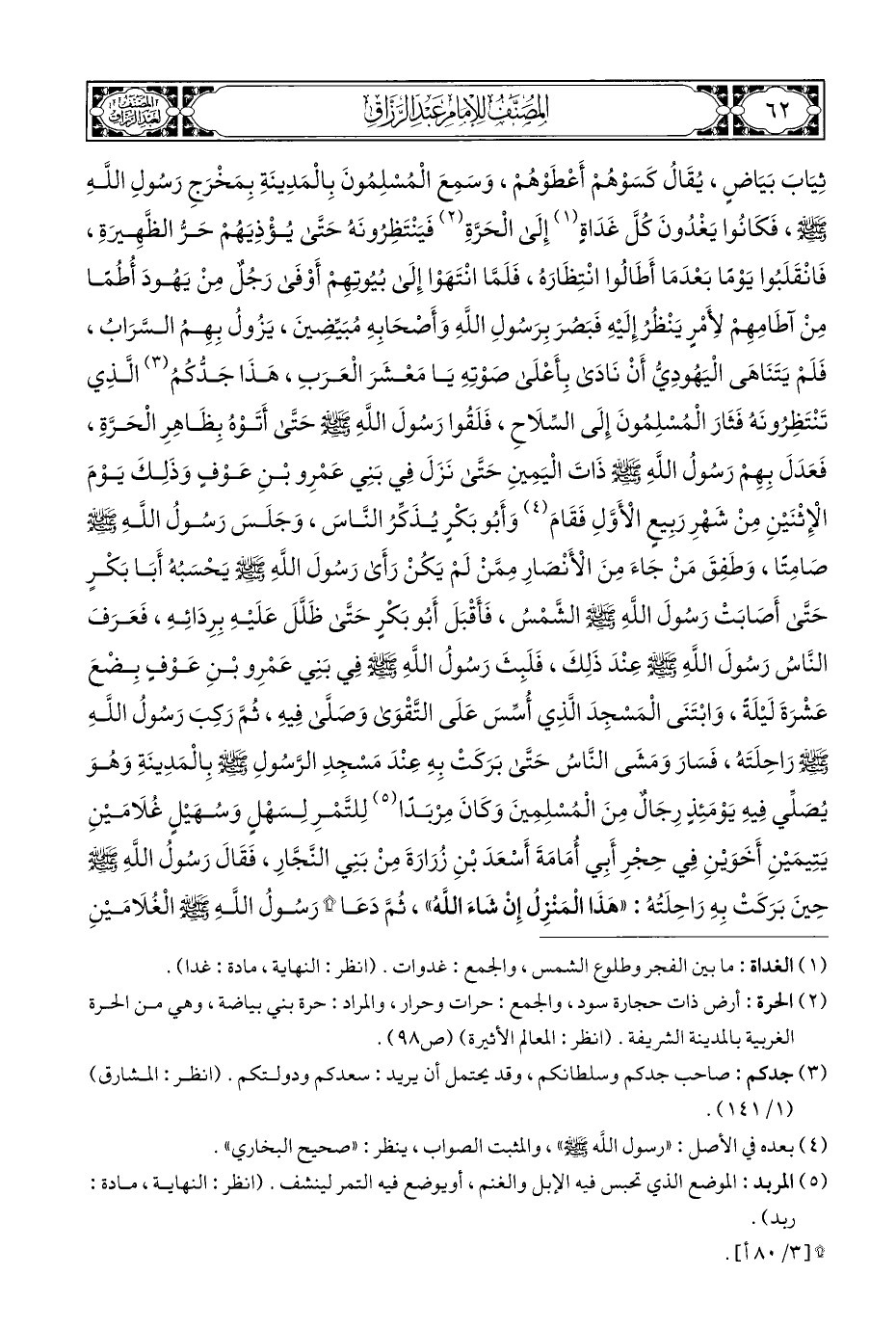 (¬٢) الحرة: أرض ذات حجارة سود، والجمع: حرات وحرار، والمراد: حرة بني بياضة، وهي من الحرة الغربية بالمدينة الشريفة. (انظر: المعالم الأثيرة) (ص ٩٨).