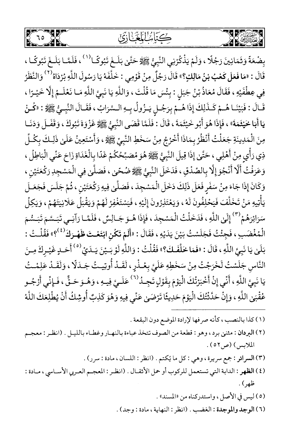 بِضْعَةً وَثَمَانِينَ رَجُلًا، وَلَمْ يَذْكُرْنِي النَّبِي - صلى الله عليه وسلم - حَتَّى بَلَغَ تَبُوكًا (¬١)، فَلَمَّا بَلَغَ تَبُوكًا، قَالَ: "مَا فَعَلَ كَعْبُ بْنُ مَالِكٍ؟ " قَالَ رَجُلٌ مِنْ قَوْمِي: خَلَّفَهُ يَا رَسُولَ اللَّهِ بُرْدَاهُ (¬٢) وَالنَّظَرُ فِي عِطْفَيْهِ، فَقَالَ مُعَاذُ بْنُ جَبَلٍ: بِئْسَ مَا قُلْتَ، وَاللهِ يَا نَبِيَّ اللَّهِ مَا نَعْلَمُ إِلَّا خَيْرًا، قَالَ: فَبَيْنَا هُمْ كَذَلِكَ إِذَا هُمْ بِرَجُلٍ يَزُولُ بِهِ السَّرَابُ، فَقَالَ النَّبِيُّ - صلى الله عليه وسلم -: "كُنْ يَا أَبَا خَيْثَمَةَ"، فَإِذَا هُوَ أَبُو خَيْثَمَةَ، قَالَ: فَلَمَّا قَضَى النَّبِيُّ - صلى الله عليه وسلم - غزْوَةَ تَبُوكَ، وَقَفَلَ وَدَنَا مِنَ الْمَدِينَةِ جَعَلْتُ أَنْظُرُ بِمَاذَا أَخْرُجُ مِنْ سَخَطِ النَّبِيِّ - صلى الله عليه وسلم -، وَأَسْتَعِينُ عَلَى ذَلِكَ بِكُلِّ ذِي رَأْيٍ مِنْ أَهْلِي، حَتَّى إِذَا قِيلَ النَّبِيُّ - صلى الله عليه وسلم - هوَ مُصَبِّحُكُمْ غَدًا بِالْغَدَاةِ زَاحَ عَنِّي الْبَاطِلُ، وَعَرَفْتُ أَلَّا أَنْجُوَ إِلَّا بِالصِّدْقِ، فَدَخَلَ النَّبِيُّ - صلى الله عليه وسلم - ضُحًى، فَصلَّى فِي الْمَسْجِدِ رَكْعَتَيْنِ، وَكَانَ إِذَا جَاءَ مِنْ سَفَرٍ فَعَلَ ذَلِكَ دَخَلَ الْمَسْجِدَ، فَصَلَّى فِيهِ رَكْعَتَيْنِ، ثُمَّ جَلَسَ فَجَعَلَ يَأْتِيهِ مَنْ تَخَلَّفَ فَيَحْلِفُونَ لَهُ، وَيَعْتَذِرُونَ إِلَيْهِ، فَيَسْتَغْفِرُ لَهُمْ وَيَقْبَلُ عَلَانِيَتَهُمْ، وَيَكِلُ سَرَائِرَهُمْ (¬٣) إِلَى اللَّهِ، فَدَخَلْتُ الْمَسْجِدَ، فَإِذَا هُوَ جَالِسٌ، فَلَمَّا رَآنِي تَبَسَّمَ تَبَسُّمَ الْمُغْضَبِ، فَجِئْتُ فَجَلَسْتُ بَيْنَ يَدَيْهِ، فَقَالَ: "أَلَمْ تَكُنِ ابْتَعْتَ ظَهْرَكَ (¬٤)؟ " فَقُلْتُ: بَلَى يَا نَبِيَّ اللَّهِ، قَالَ: "فَمَا خَلَّفَكَ؟ " فَقُلْتُ: وَاللَّهِ لَوْ بَيْنَ يَدَي (¬٥) أَحَدٍ غَيْرِكَ مِنَ النَّاسِ جَلَسْتُ لَخَرَجْتُ مِنْ سَخَطِهِ عَلَيَّ بِعُذْرٍ، لَقَدْ أُوتِيتُ جَدَلًا، وَلَقَدْ عَلِمْتُ يَا نَبِيَّ اللهِ، أَنِّي إِنْ أَخْبَرْتُكَ الْيَوْمَ بِقَوْلٍ تَجِدُ (¬٦) عَلَيَّ فِيهِ، وَهُوَ حَقٌّ، فَإِنِّي أَرْجُو عُقْبَى اللَّهِ، وَإِنْ حَدَّثْتُكَ الْيَوْمَ حَدِيثًا تَرْضَى عَنِّي فِيهِ وَهُوَ كَذِبٌ أُوشِكُ أَنْ يُطْلِعَكَ اللَّهُ