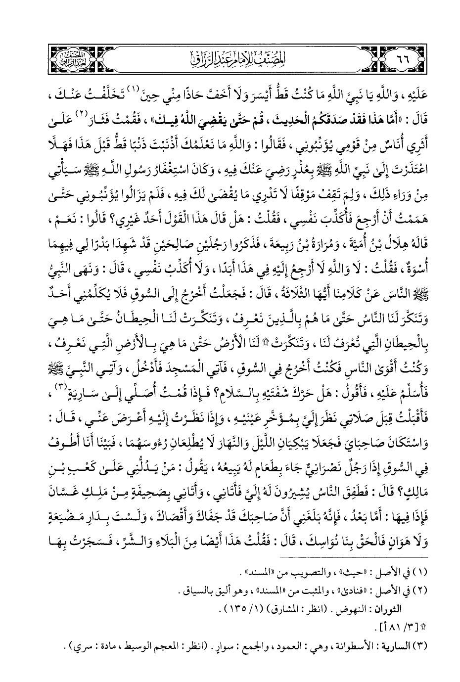 عَلَيْهِ، وَاللَّهِ يَا نَبِيَّ اللَّهِ مَا كُنْتُ قَطُّ أَيْسَرَ وَلَا أَخَفَّ حَاذًا مِنِّي حِينَ (¬١) تَخَلَّفْتُ عَنْكَ، قَالَ: "أَمَّا هَذَا فَقَدْ صَدَقَكُمُ الْحَدِيثَ، قُمْ حَتى يَقْضِيَ اللَّهُ فِيكَ"، فَقُمْتُ فَثَارَ (¬٢) عَلَى أَثَرِي أُنَاسٌ مِنْ قَوْمِي يُؤَنِّبُونِي، فَقَالُوا: وَاللَّهِ مَا نَعْلَمُكَ أَذْنَبْتَ ذَنْبًا قَطُّ قَبْلَ هَذَا فَهَلَّا اعْتَذَرْتَ إِلَى نَبِيِّ اللَّهِ - صلى الله عليه وسلم - بِعُذْرٍ رَضِيَ عَنْكَ فِيهِ، وَكَانَ اسْتِغْفَارُ رَسُولِ اللَّهِ - صلى الله عليه وسلم - سَيَأْتي مِنْ وَرَاءِ ذَلِكَ، وَلِمَ تَقِفْ مَوْقِفًا لَا تَدْرِي مَا يُقْضَى لَكَ فِيهِ، فَلَمْ يَزَالُوا يُؤَنِّبُونِي حَتَّى هَمَمْتُ أَنْ أَرْجِعَ فَأُكَذِّبَ نَفْسِي، فَقُلْتُ: هَلْ قَالَ هَذَا الْقَوْلَ أَحَدٌ غَيْرِي؟ قَالُوا: نَعَمْ، قَالَهُ هِلَالُ بْنُ أمَيُّةَ، وَمُرَارَةُ بْنُ رَبِيعَةَ، فَذَكَرُوا رَجُلَيْنِ صَالِحَيْنِ قَدْ شَهِدَا بَدْرًا لِي فِيهِمَا أُسْوَةٌ، فَقُلْتُ: لَا وَاللَّهِ لَا أَرْجِعُ إِلَيْهِ فِي هَذَا أَبَدًا، وَلَا أكُذِّبُ نَفْسِي، قَالَ: وَنَهَى النَّبِيُّ - صلى الله عليه وسلم - النَّاسَ عَنْ كَلَامِنَا أَيُّهَا الثَّلَاثَةُ، قَالَ: فَجَعَلْتُ أَخْرُجُ إِلَى السُّوقِ فَلَا يُكَلِّمُنِي أَحَدٌ وَتَنَكَّرَ لَنَا النَّاسُ حَتَّى مَا هُمْ بِالَّذِينَ نَعْرِفُ، وَتَنَكَّرَتْ لَنَا الْحِيطَانُ حَتَّى مَا هِيَ بِالْحِيطَانِ الَّتِي تُعْرَفُ لَنَا، وَتَنَكَّرَتْ * لَنَا الْأَرْضُ حَتَّى مَا هِيَ بِالْأَرْضِ الَّتِي نَعْرِفُ، وَكُنْتُ أَقْوَى النَّاسِ فَكُنْتُ أَخْرُجُ فِي السُّوقِ، فَآتِي الْمَسْجِدَ فَأَدْخُلُ، وَآتِي النَّبِيَّ - صلى الله عليه وسلم - فَأُسَلِّمُ عَلَيْهِ، فَأَقُولُ: هَلْ حَرَّكَ شَفَتَيْهِ بِالسَّلَامِ؟ فَإِذَا قُمْتُ أُصلِّي إِلَى سَارِيَةٍ (¬٣)، فَأَقْبَلْتُ قِبَلَ صَلَاتي نَظَرَ إِلَيَّ بِمُؤَخَّرِ عَيْنَيْهِ، وإِذَا نَظَرْتُ إِلَيْهِ أَعْرَضَ عَنِّي، قَالَ: وَاسْتَكَانَ صَاحِبَايَ فَجَعَلَا يَبْكِيَانِ اللَّيْلَ وَالنَّهَارَ لَا يُطْلِعَانِ رُءُوسَهُمَا، فَبَيْنَا أَنَا أَطُوفُ فِي السُّوقِ إِذَا رَجُلٌ نَصرَانِيٌّ جَاءَ بِطَعَامٍ لَهُ يَبِيعُهُ، يَقُولُ: مَنْ يَدُلُّنِي عَلَى كَعْبِ بْنِ مَالِكٍ؟ قَالَ: فَطَفِقَ النَّاسُ يُشِيرُونَ لَهُ إِلَيَّ فَأَتَانِي، وَأَتَانِي بِصَحِيفَةٍ مِنْ مَلِكِ غَسَّانَ فَإِذَا فِيهَا: أَمَّا بَعْدُ، فَإِنَّهُ بَلَغَنِي أَنَّ صَاحِبَكَ قَدْ جَفَاكَ وَأَقْصَاكَ، وَلَسْتَ بِدَارِ مَضْيَعَةٍ وَلَا هَوَانٍ فَالْحَقْ بِنَا نُوَاسِكَ، قَالَ: فَقُلْتُ هَذَا أَيْضًا مِنَ الْبَلَاءِ وَالشَّرِّ، فَسَجَرْتُ بِهَا
