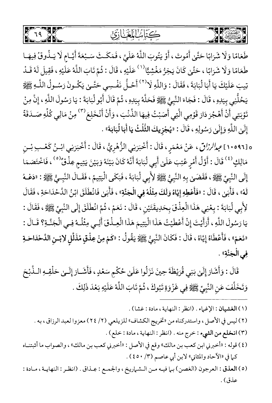 ° [١٠٥٩٦] عبد الرزاق، عَنْ مَعْمَرٍ، قَالَ: أَخْبَرَنِي الزُّهْرِيُّ، قَالَ: أَخْبَرَنِي ابْنُ كَعْبِ بْنِ مَالِكٍ (¬٤) قَالَ: أَوَّلُ أَمْرٍ عُتِبَ عَلَى أَبِي لُبَابَةَ أَنَّهُ كَانَ بَيْنَهُ وَبَيْنَ يَتِيمٍ عِذْقٌ (¬٥)، فَاخْتَصَمَا إِلَى النَّبِيِّ - صلى الله عليه وسلم -، فَقَضَى بِهِ النَّبِيُّ - صلى الله عليه وسلم - لِأَبِي لُبَابَةَ، فَبَكَى الْيَتِيمُ، فَقَالَ النَّبِيُّ - صلى الله عليه وسلم -: "دَعْهُ لَهُ"، فَأَبَى، قَالَ: "فَأَعْطِهِ إِيَّاهُ وَلَكَ مِثْلُهُ فِي الْجَنَّةِ"، فَأَبَى فَانْطَلَقَ ابْنُ الدَّحْدَاحَةِ، فَقَالَ لِأَبِي لُبَابَةَ: بِعْنِي هَذَا الْعِذْقَ بِحَدِيقَتَيْنِ، قَالَ: نَعَمْ، ثُمَّ انْطَلَقَ إِلَى النَّبِيِّ - صلى الله عليه وسلم -، فَقَالَ: يَا رَسُولَ اللَّهِ، أَرَأَيْتَ إِنْ أَعْطَيْتُ هَذَا الْيَتِيمَ هَذَا الْعِذْقَ أَلِي مِثْلُهُ فِي الْجَنَّةِ؟ قَالَ: "نَعَمْ"، فَأَعْطَاهُ إِيَّاهُ، قَالَ: فَكَانَ النَّبِيُّ - صلى الله عليه وسلم - يَقُولُ: "كَمْ مِنْ عِذْقٍ مُذَلَّلٍ لاِبْنِ الدَّحْدَاحَةِ فِي الْجَنَّةِ".