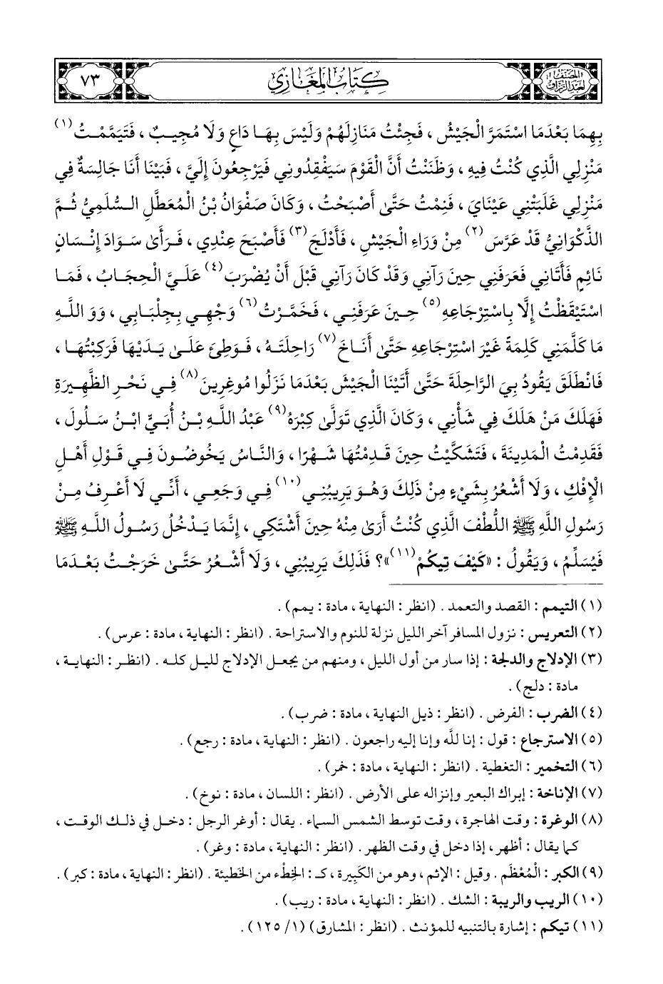 بِهِمَا بَعْدَمَا اسْتَمَرَّ الْجَيْشُ، فَجِئْتُ مَنَازِلَهُمْ وَلَيْسَ بِهَا دَاعٍ وَلَا مُجِيبٌ، فَتَيَمَّمْتُ (¬١) مَنْزِلِي الَّذِي كُنْتُ فِيهِ، وَظَنَنْتُ أَنَّ الْقَوْمَ سَيَفْقِدُونِي فَيَرْجِعُونَ إِلَيَّ، فَبَيْنَا أَنَا جَالِسَةٌ فِي مَنْزِلِي غَلَبَتْنِي عَيْنَايَ، فَنِمْتُ حَتَّى أَصبَحْتُ، وَكَانَ صَفْوَانُ بْنُ الْمُعَطَّلِ السُّلَمِيُّ ثُمَّ الذَّكْوَانِيُّ قَدْ عَرَّسَ (¬٢) مِنْ وَرَاءِ الْجَيْشِ، فَأَدْلَجَ (¬٣) فَأَصبَحَ عِنْدِي، فَرَأَى سَوَادَ إِنْسَانٍ نَائِمٍ فَأَتَانِي فَعَرَفَنِي حِينَ رَآنِي وَقَدْ كَانَ رَآنِي قَبْلَ أَنْ يُضْرَبَ (¬٤) عَلَيَّ الْحِجَابُ، فَمَا اسْتَيقَظْتُ إِلَّا بِاسْتِرْجَاعِهِ (¬٥) حِينَ عَرَفَنِى، فَخَمَّرْتُ (¬٦) وَجْهِى بِجِلْبَابِى، وَوَاللهِ مَا كَلَّمَنِي كَلِمَةً غَيرَ اسْتِرْجَاعِهِ حَتَّى أَنَاخَ (¬٧) رَاحِلَتَهُ، فَوَطِئَ عَلَى يَدَيْهَا فَرَكِبْتُهَا، فَانْطَلَقَ يَقُودُ بِيَ الرَّاحِلَةَ حَتَّى أَتَيْنَا الْجَيْشَ بَعْدَمَا نَزَلُوا مُوغِرِينَ (¬٨) فِي نَحْرِ الظَّهِيرَةِ فَهَلَكَ مَنْ هَلَكَ فِي شَأْنِي، وَكَانَ الَّذِي تَوَلَّى كِبْرَهُ (¬٩) عَبْدُ اللَّهِ بْنُ أُبَيِّ ابْنُ سَلُولَ، فَقَدِمْتُ الْمَدِينَةَ، فَتَشَكَّيْتُ حِينَ قَدِمْتُهَا شَهْرًا، وَالنَّاسُ يَخُوضونَ فِي قَوْلِ أَهْلِ الْإِفْكِ، وَلَا أَشْعُرُ بِشَيءٍ مِنْ ذَلِكَ وَهُوَ يَرِيبُنِي (¬١٠) فِي وَجَعِي، أَنِّي لَا أَعْرِفُ مِنْ رَسُولِ اللَّهِ - صلى الله عليه وسلم - اللُّطْفَ الَّذِي كُنْتُ أَرَى مِنْهُ حِينَ أَشْتَكِي، إِنَّمَا يَدْخُلُ رَسُولُ اللَّهِ - صلى الله عليه وسلم - فَيُسَلِّمُ، وَيَقُولُ: "كَيْفَ تِيكُمْ (¬١١) "؟ فَذَلِكَ يَرِيبُنِي، وَلَا أَشْعُرُ حَتَّى خَرَجْتُ بَعْدَمَا